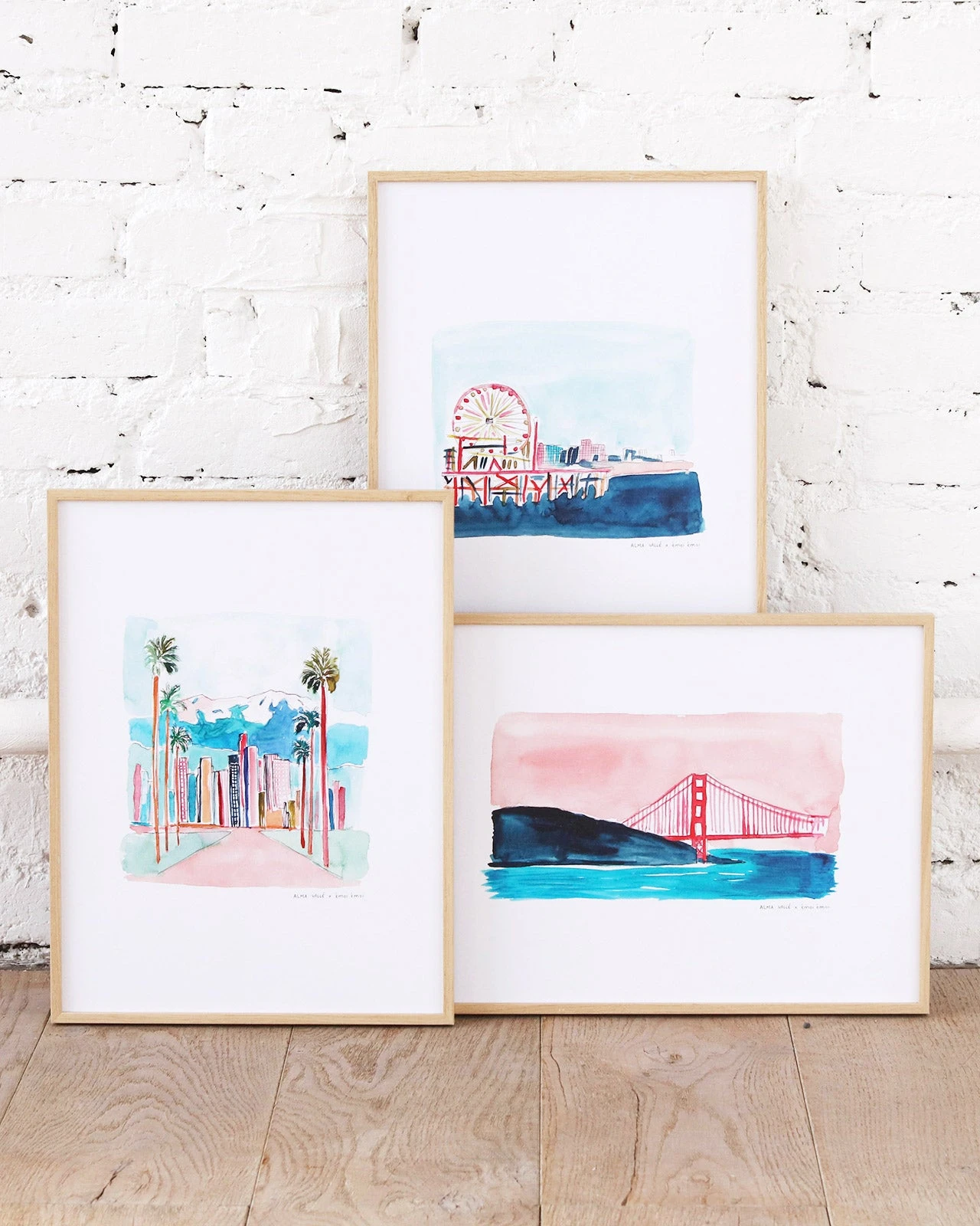 – 3 paysages peints à l’aquarelle : « Golden Gate bridge », « Santa Monica bay » et « Downtown L.A. »