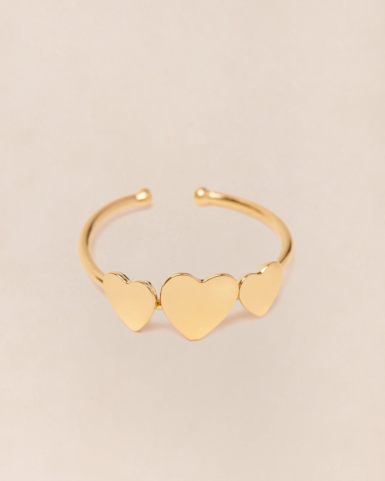 – Bague en laiton ajustable avec 3 petits cœurs plongée dans un bain d’or 24 carats