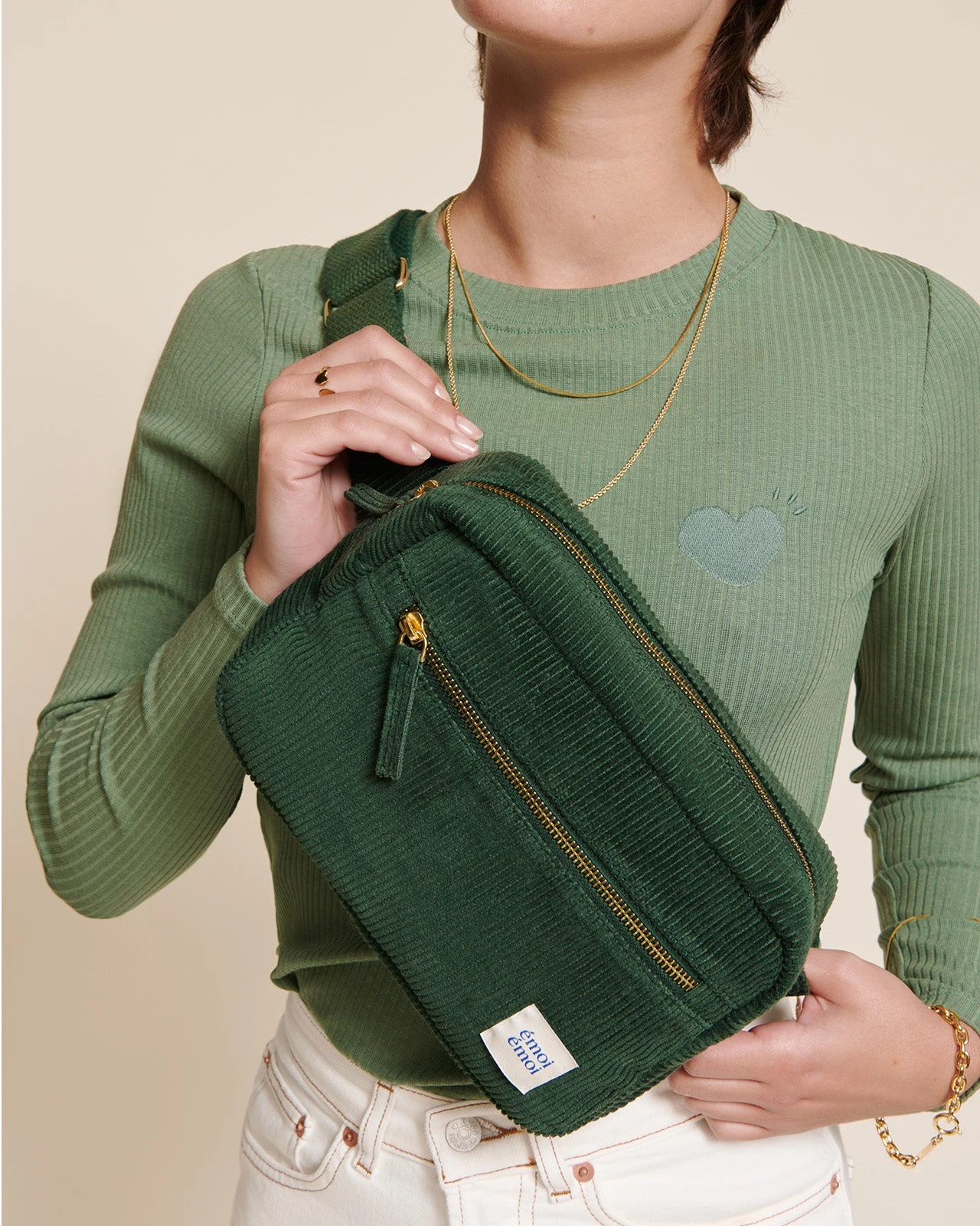– 2 poches zippées : 1 poche zippée intérieure 15×12 cm, 1 poche zippée extérieure 18×10 cm – Banane en velours côtelé, 100% coton