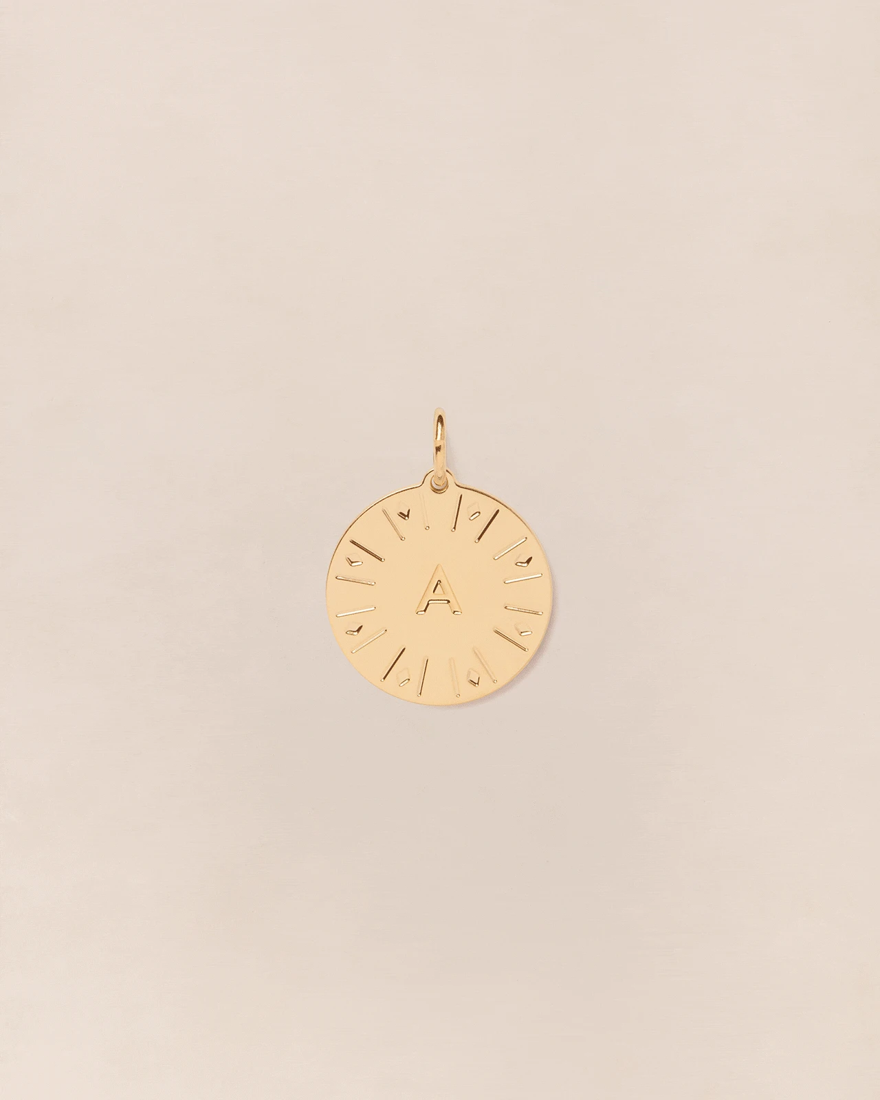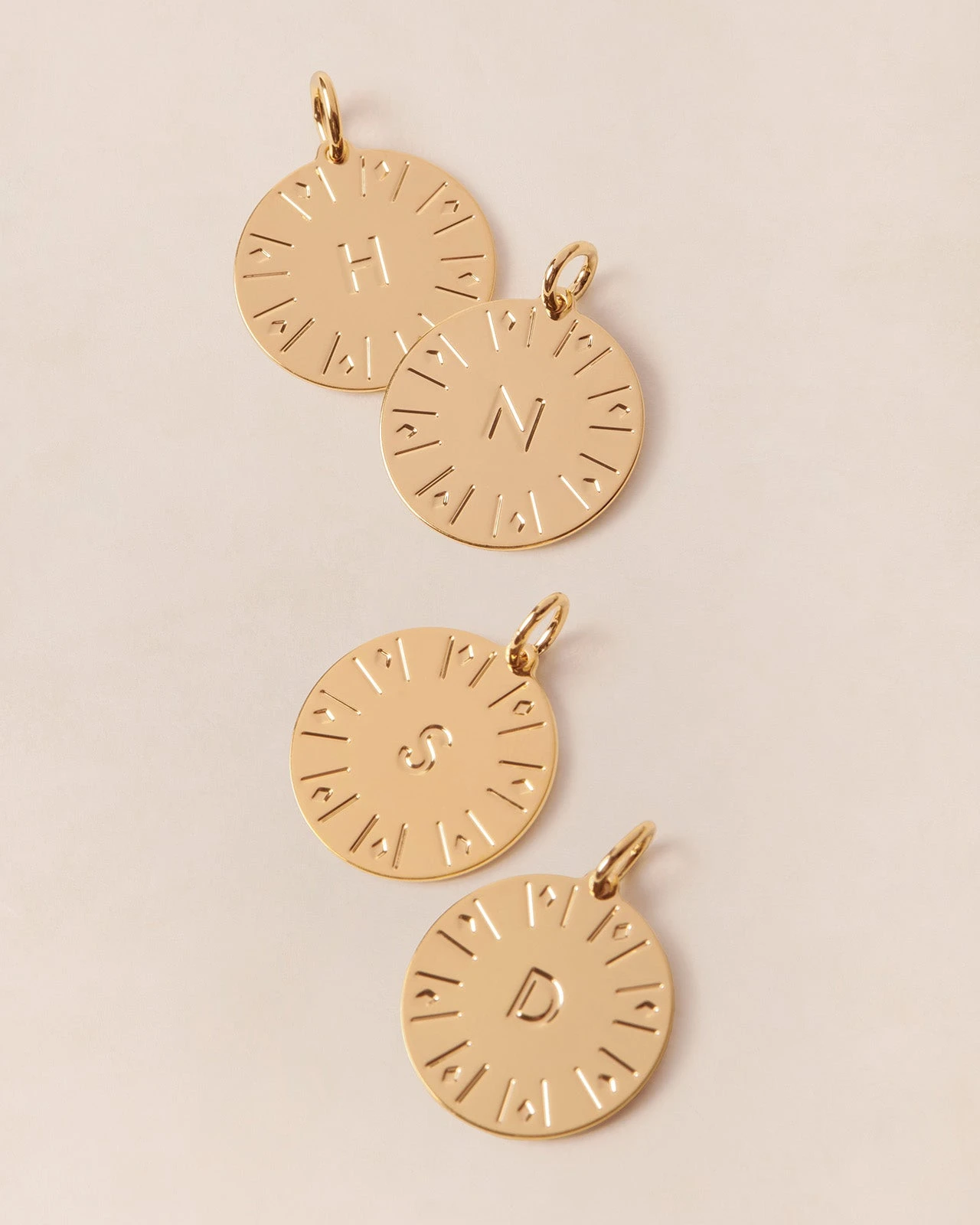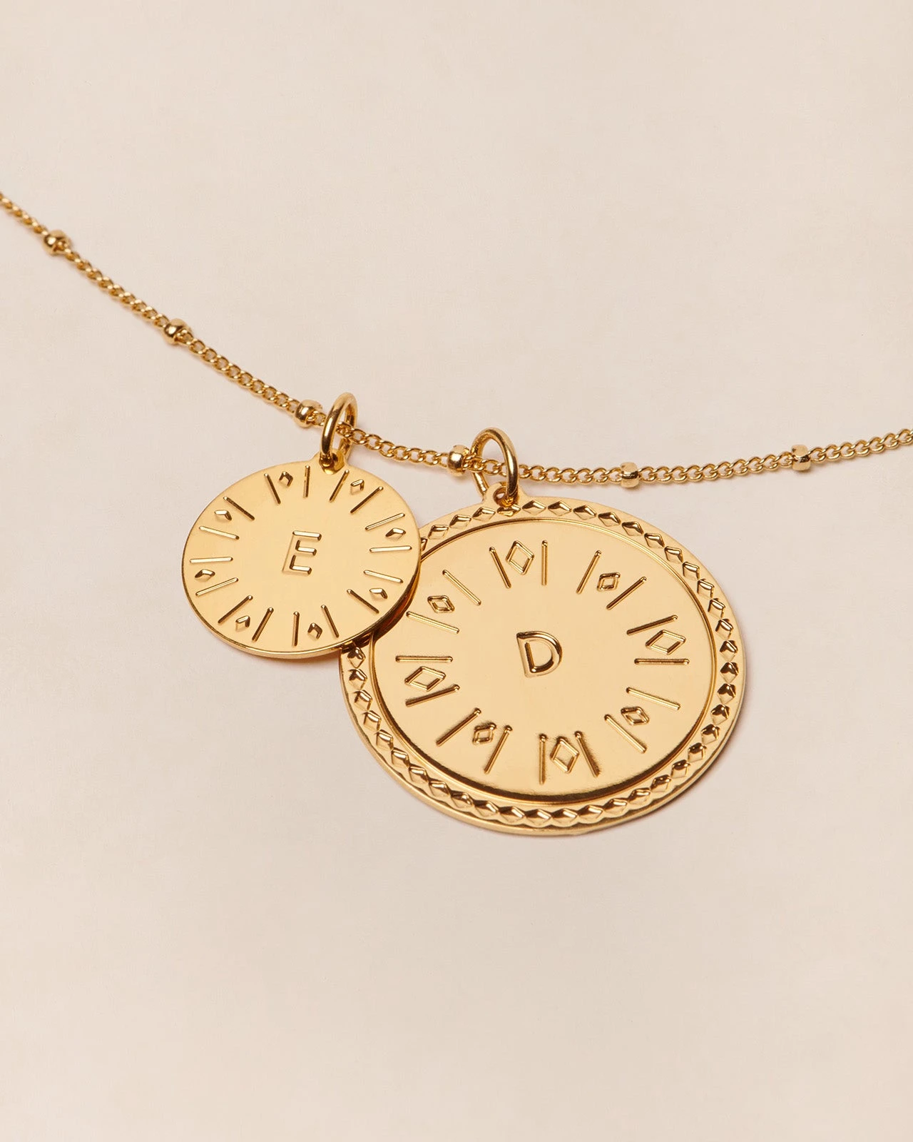 – Médaille initiale gravée, ronde, en 15 et 25mm; en laiton plongé dans un bain d’or 24 carats 1 micron