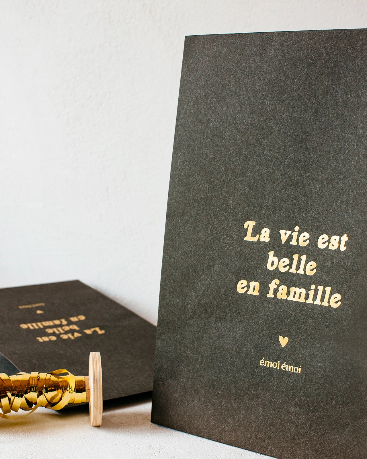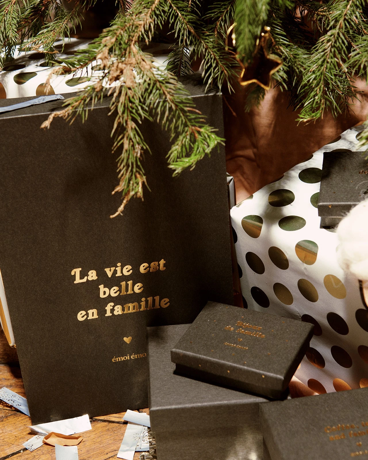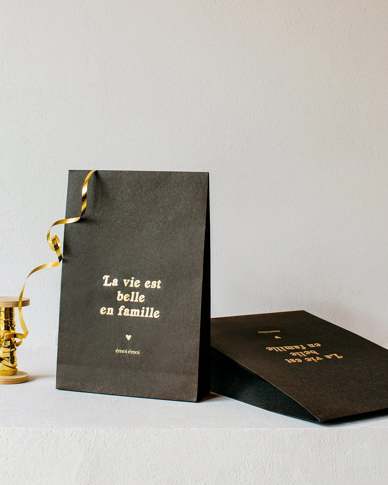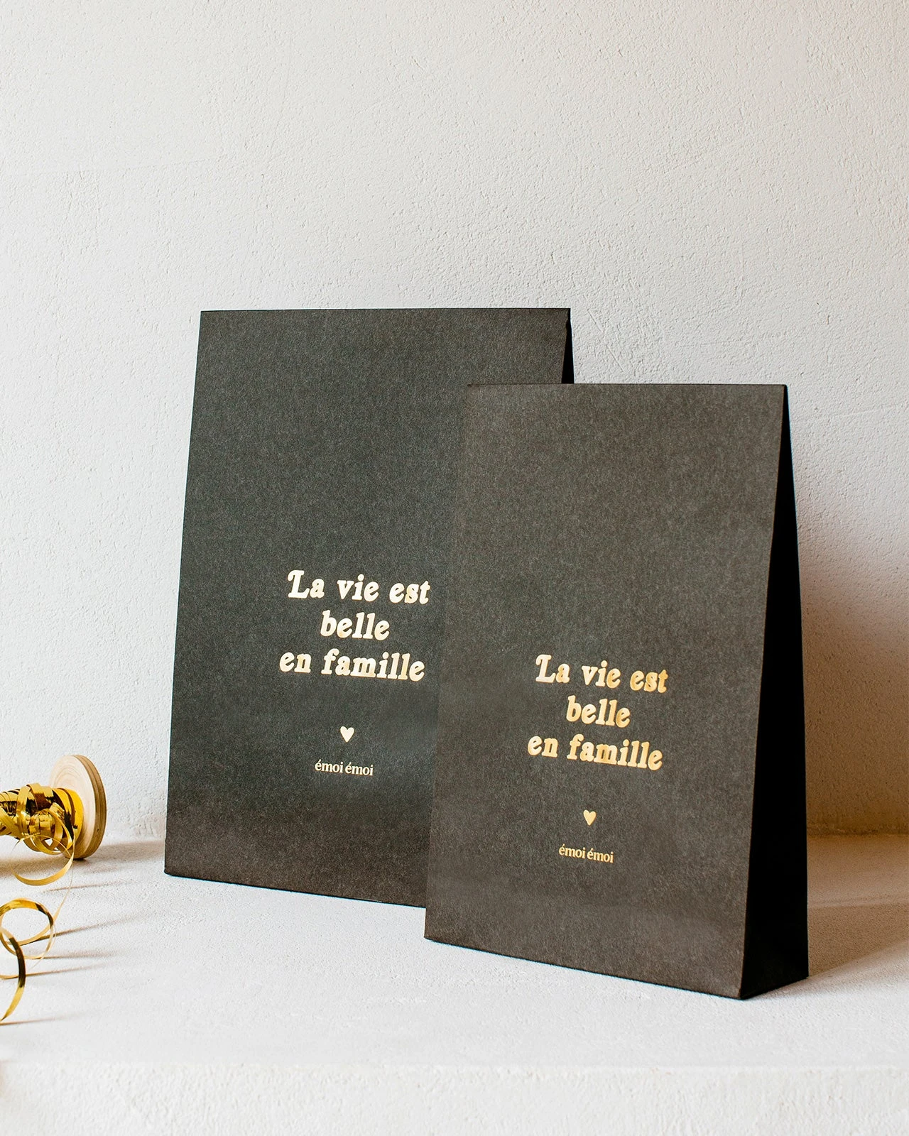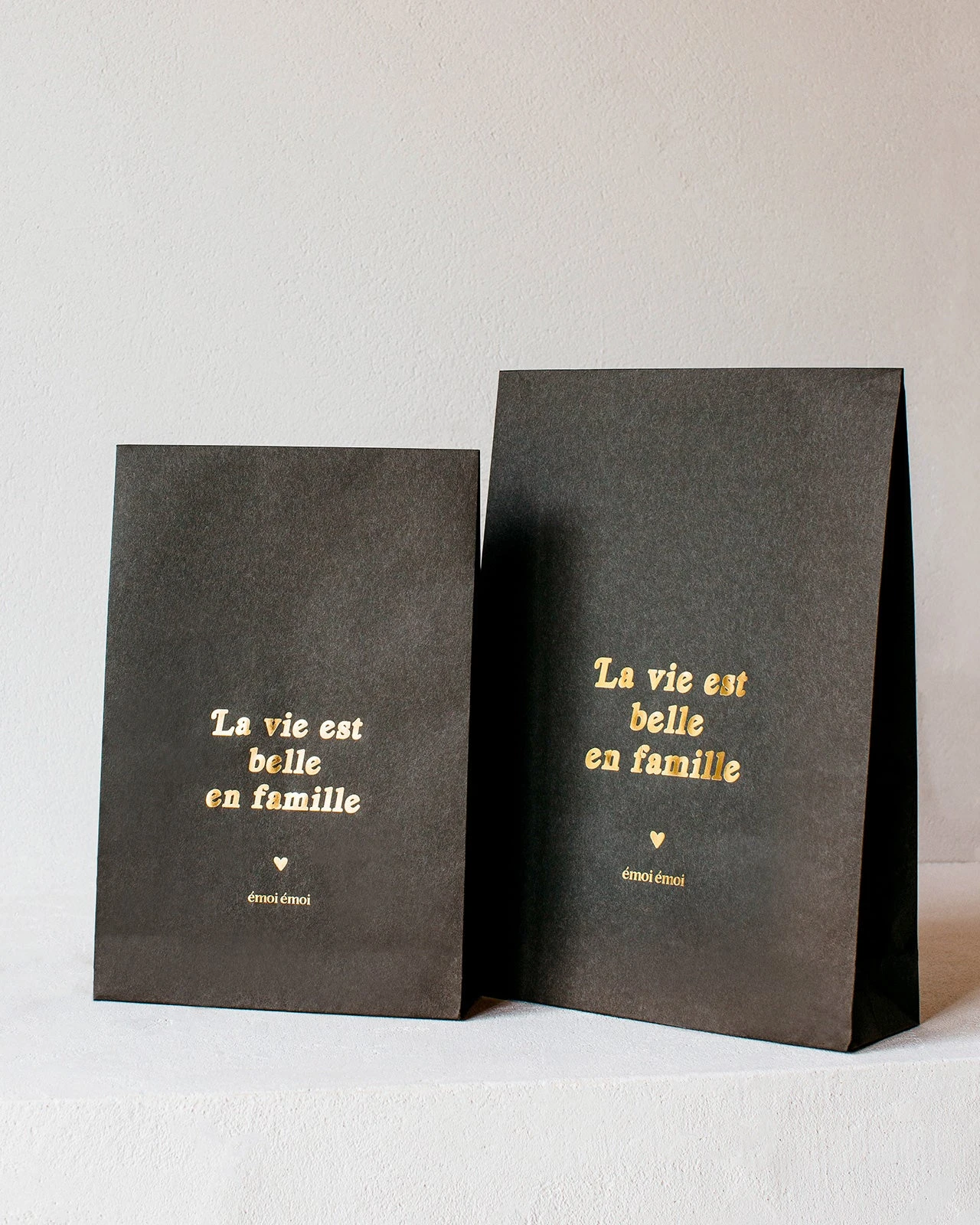 Offrez vos sweats, pulls, hoodies et marinières émoi émoi dans une pochette sobre et chic. Notre message « La vie est belle en famille » est marqué à chaud sur un grand format (27cm x 38cm). Une bande adhésive garde votre cadeau au chaud.
