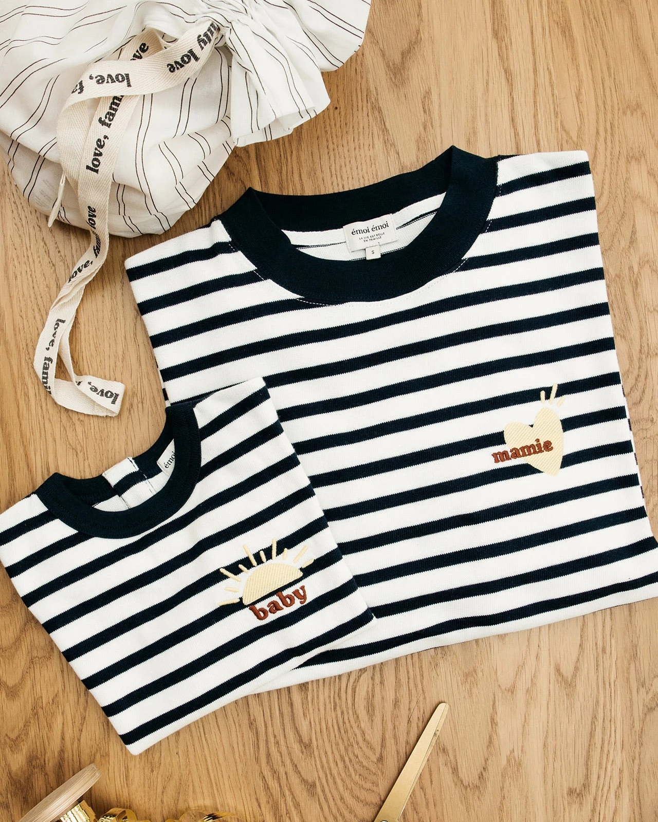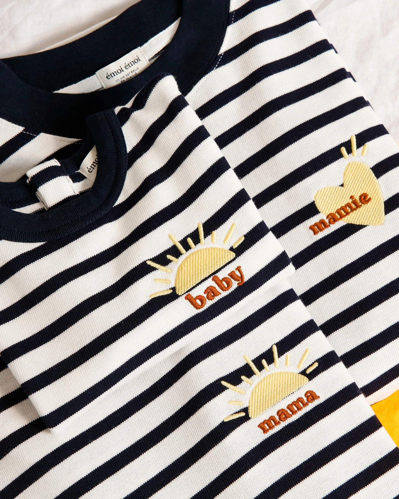 – À porter en famille avec les marinières brodées Mama Sunshine et Baby Sunshine.