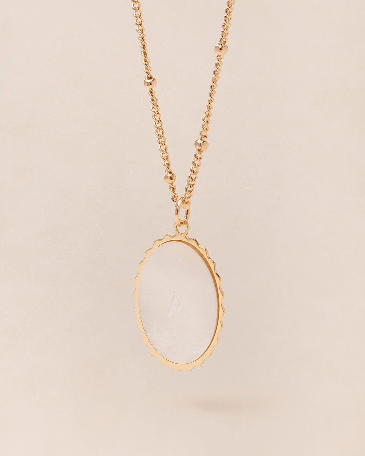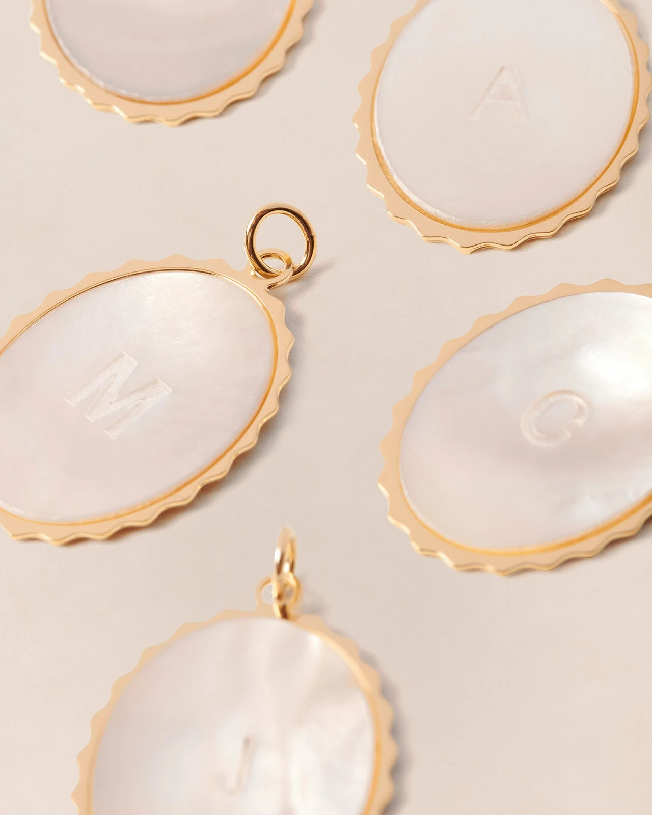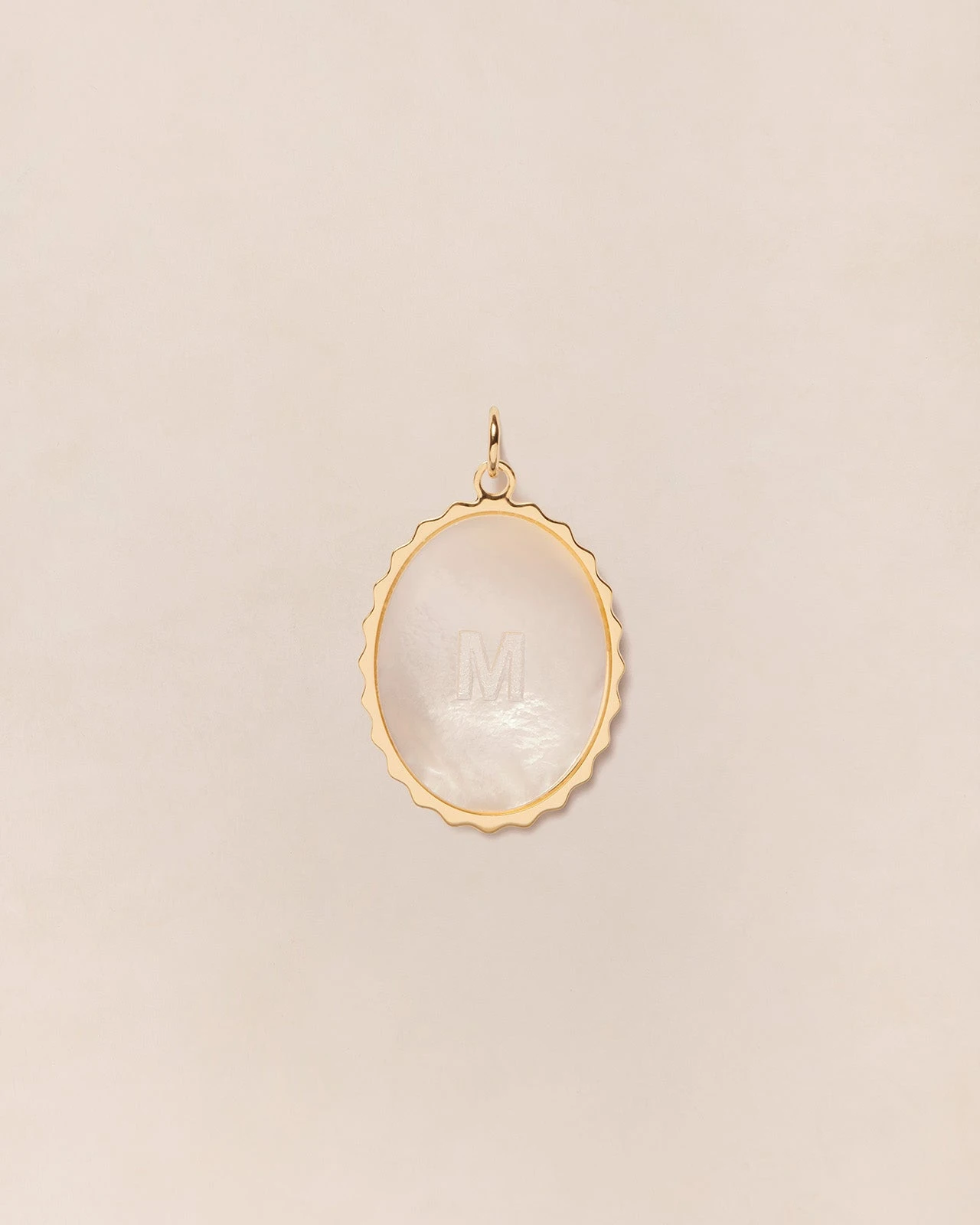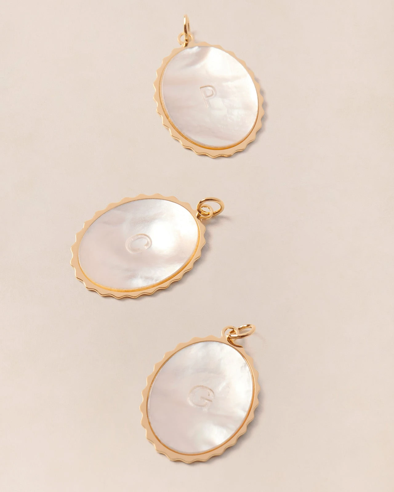 – Médaille initiale en nacre gravée, disponible en 8mm et 22mm