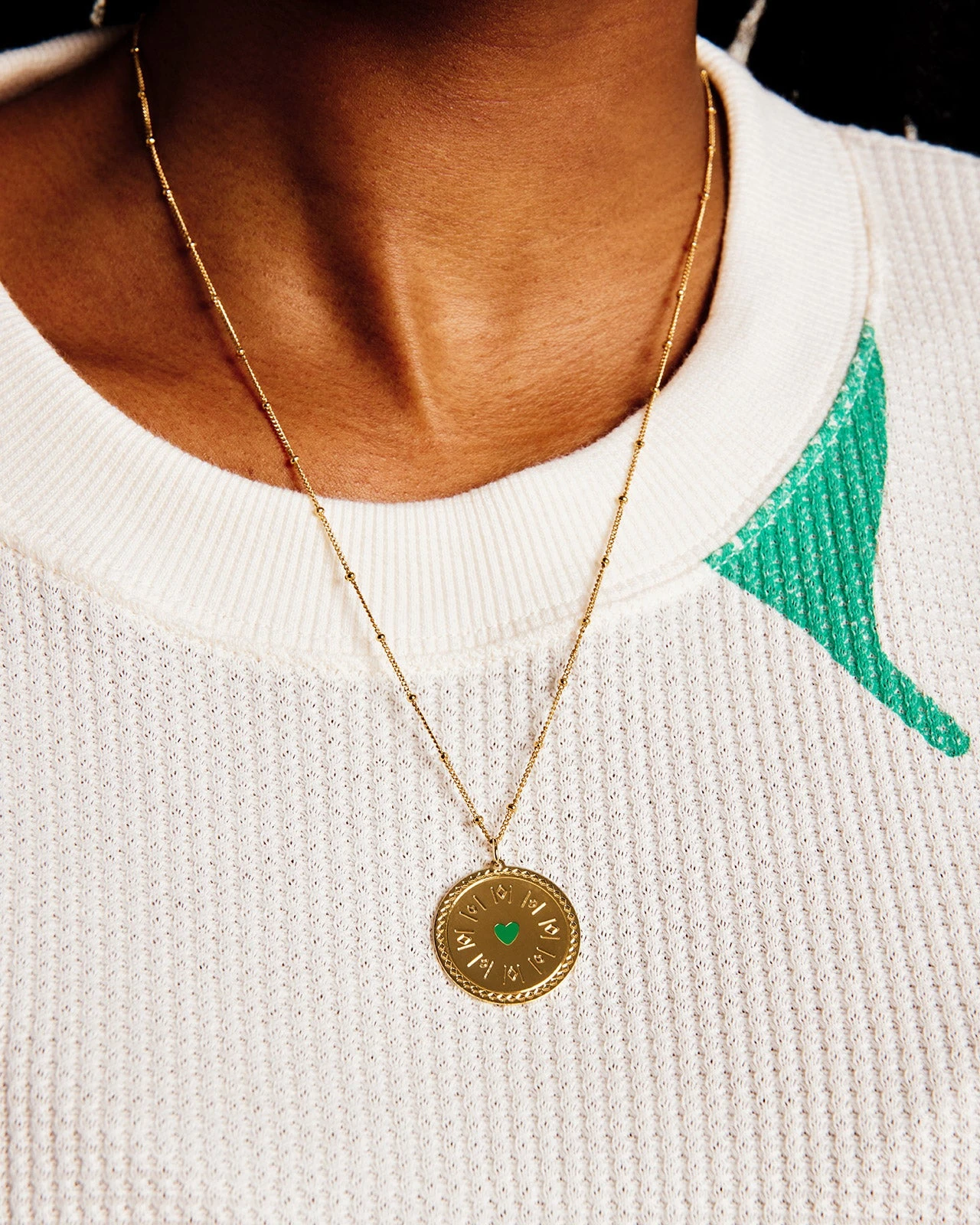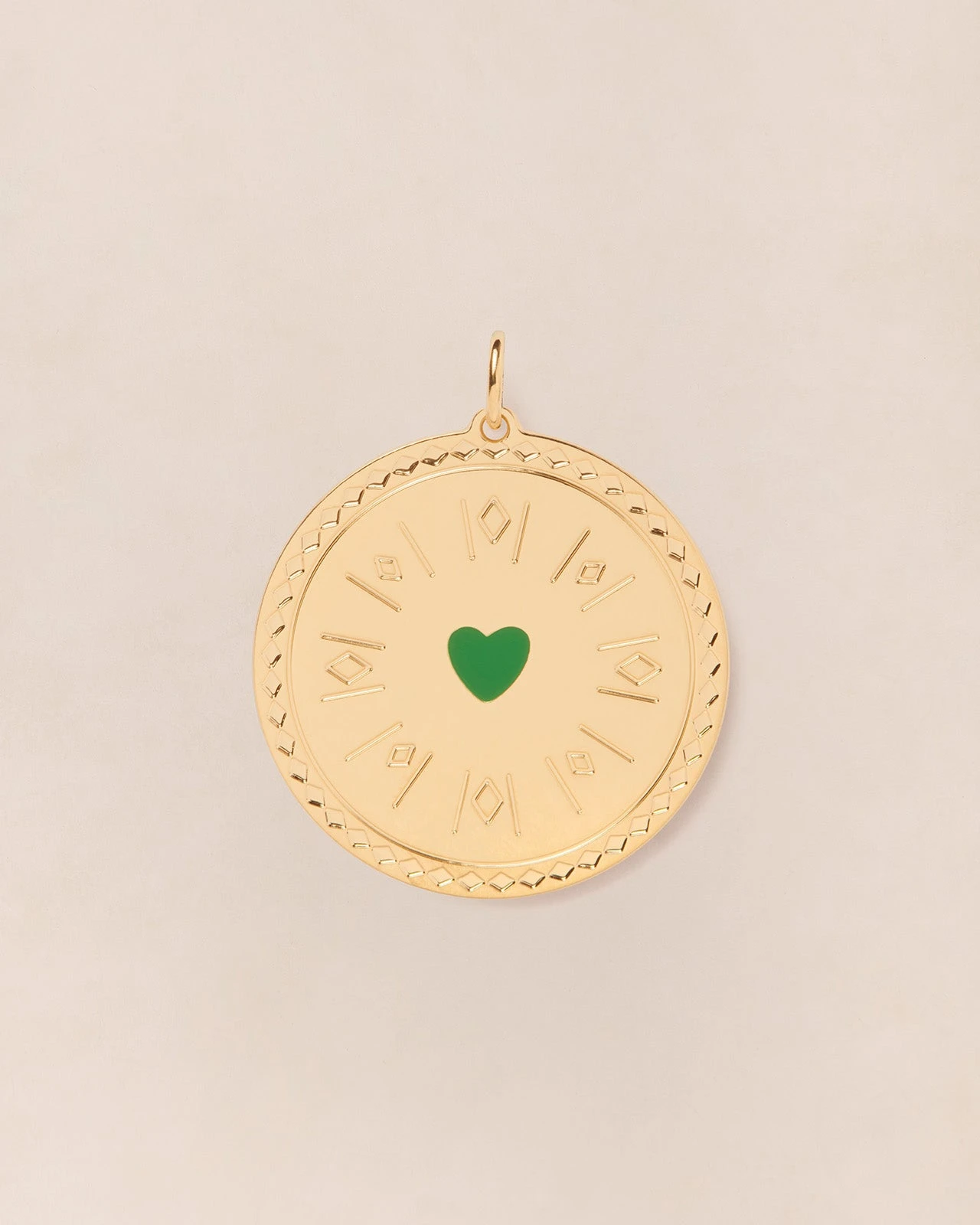 – Médaille en laiton plongée dans un bain d’or 24 carats.n- Gravures sur les contours et autour du coeur.n- Coeur vert peint à la main.n- Médailles et chaînes vendues séparément.n- 2 styles de chaînes (boules ou simple) disponibles dans 3 longueurs : ras du cou (40 cm), collier (50 cm) ou sautoir (60 cm).nnNos bijoux fantaisie sont garantis 1 an contre tout défaut de conception et de matière à compter de la date d’achat, sous réserve du respect des conseils d’entretien.nVotre bijou sera réparé ou remplacé par un bijou identique.nPour toute question, n’hésitez pas à nous écrire à [email protected].