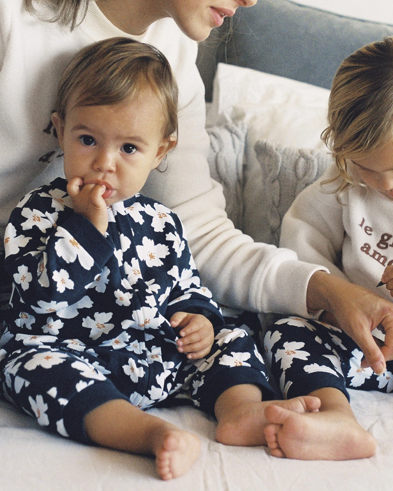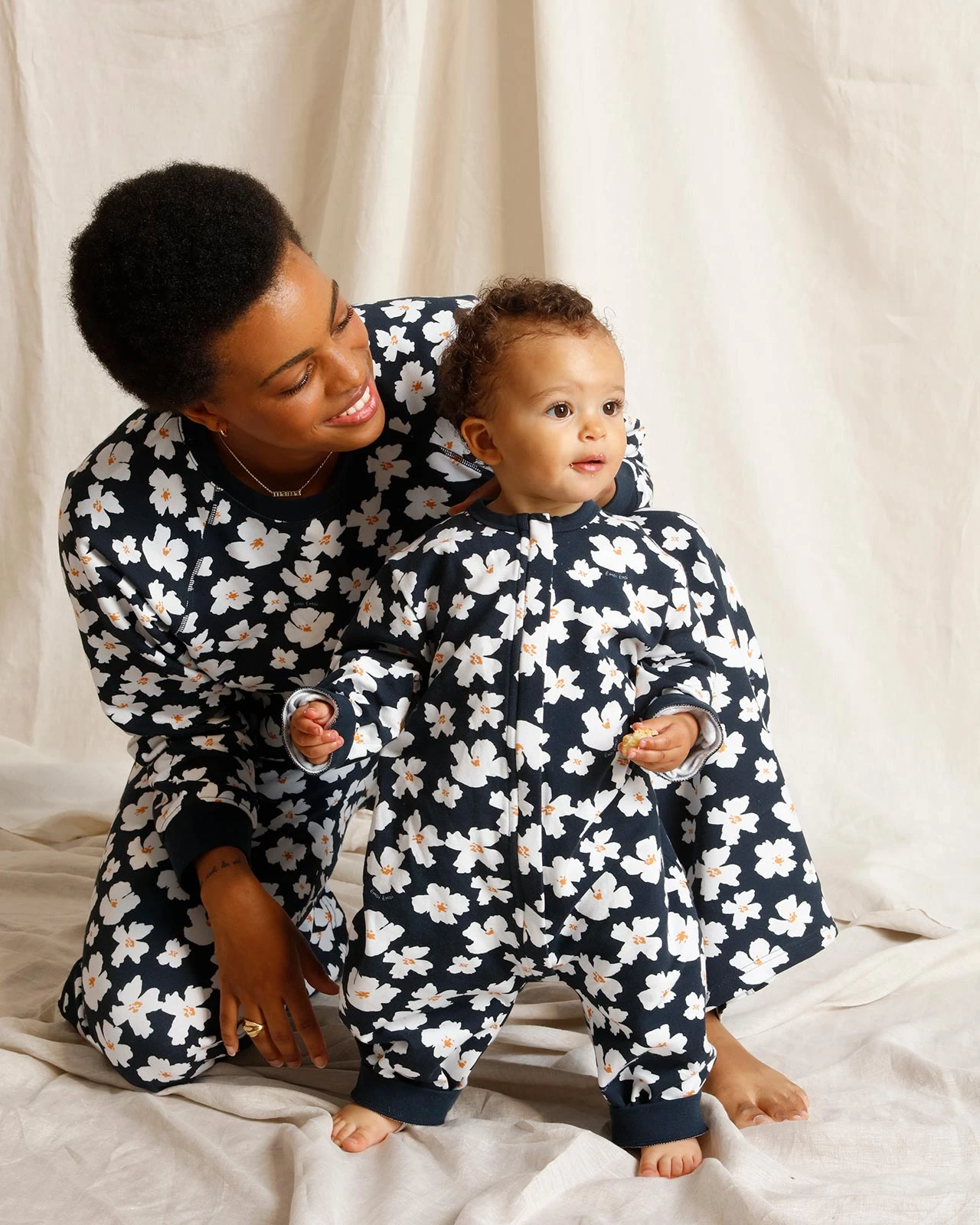 – À porter en famille avec les ensembles anémones bleu nuit femme et enfant.