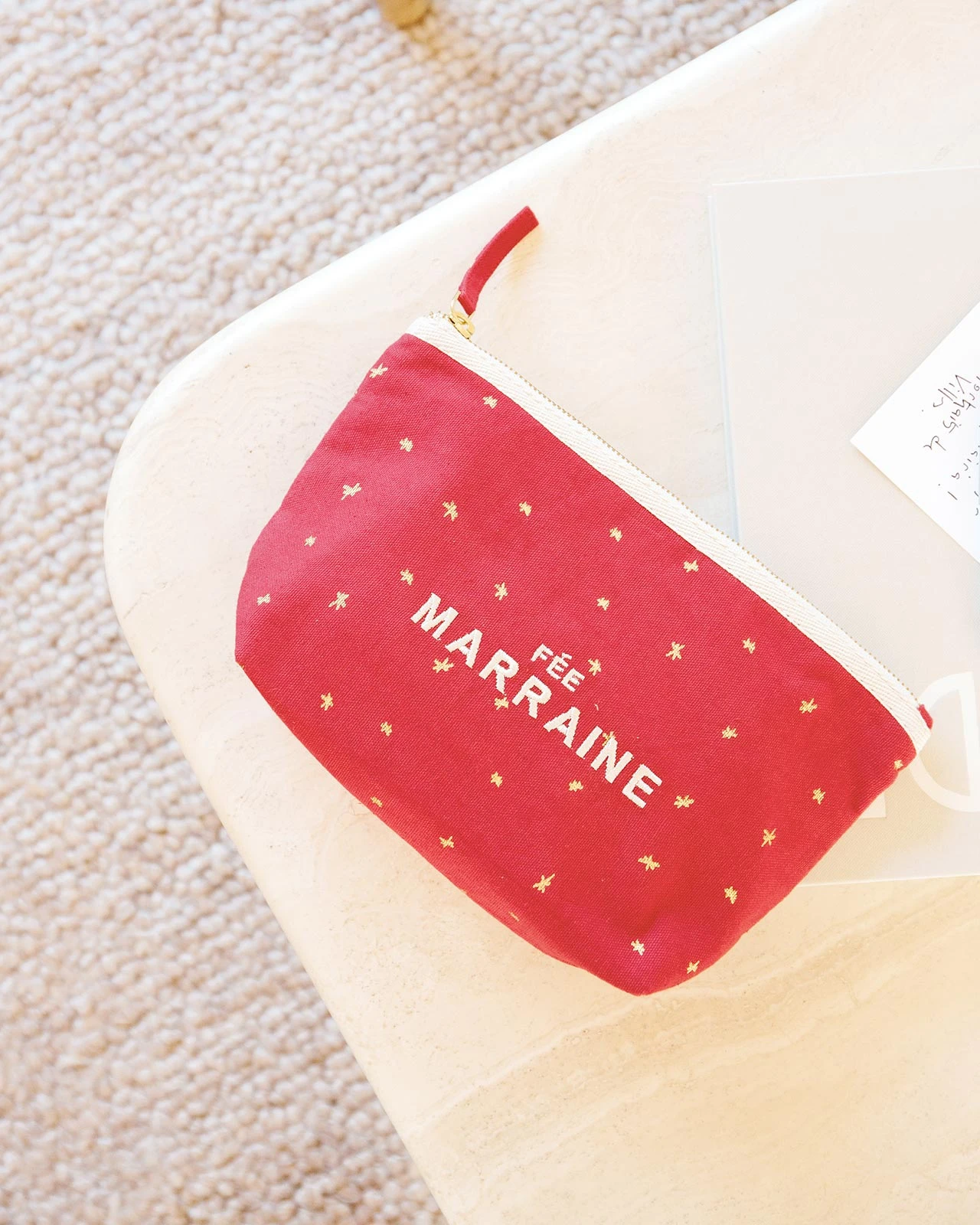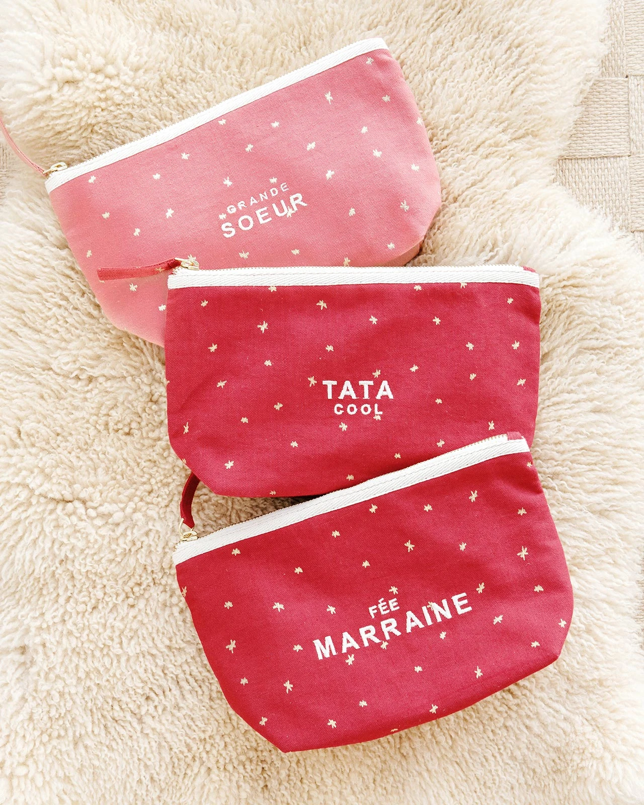 Un message à faire passer aux héroïnes de la famille ? Maman cool, mamie chérie, nounou adorée, petite sœur… Nos pochettes sont brodées de mots doux en leur honneur. Pour leur dire qu’elles comptent beaucoup beaucoup. Que la vie est très très belle avec elles. Cette déclaration, on l’a entourée d’étoiles dorées, de celles qui brillent sans compter les années-lumières. Fabriquées en Inde dans l’atelier éthique d’Ausul, Mradul et leurs équipes.