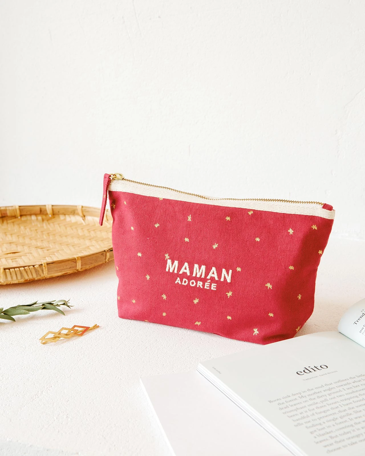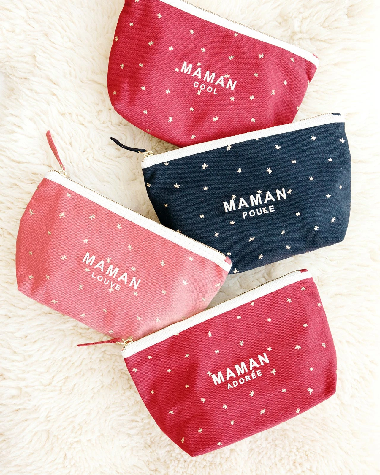 Un message à faire passer aux héroïnes de la famille ? Maman cool, mamie chérie, nounou adorée, petite sœur… Nos pochettes sont brodées de mots doux en leur honneur. Pour leur dire qu’elles comptent beaucoup beaucoup. Que la vie est très très belle avec elles. Cette déclaration, on l’a entourée d’étoiles dorées, de celles qui brillent sans compter les années-lumières. Fabriquées en Inde dans l’atelier éthique d’Ausul, Mradul et leurs équipes.