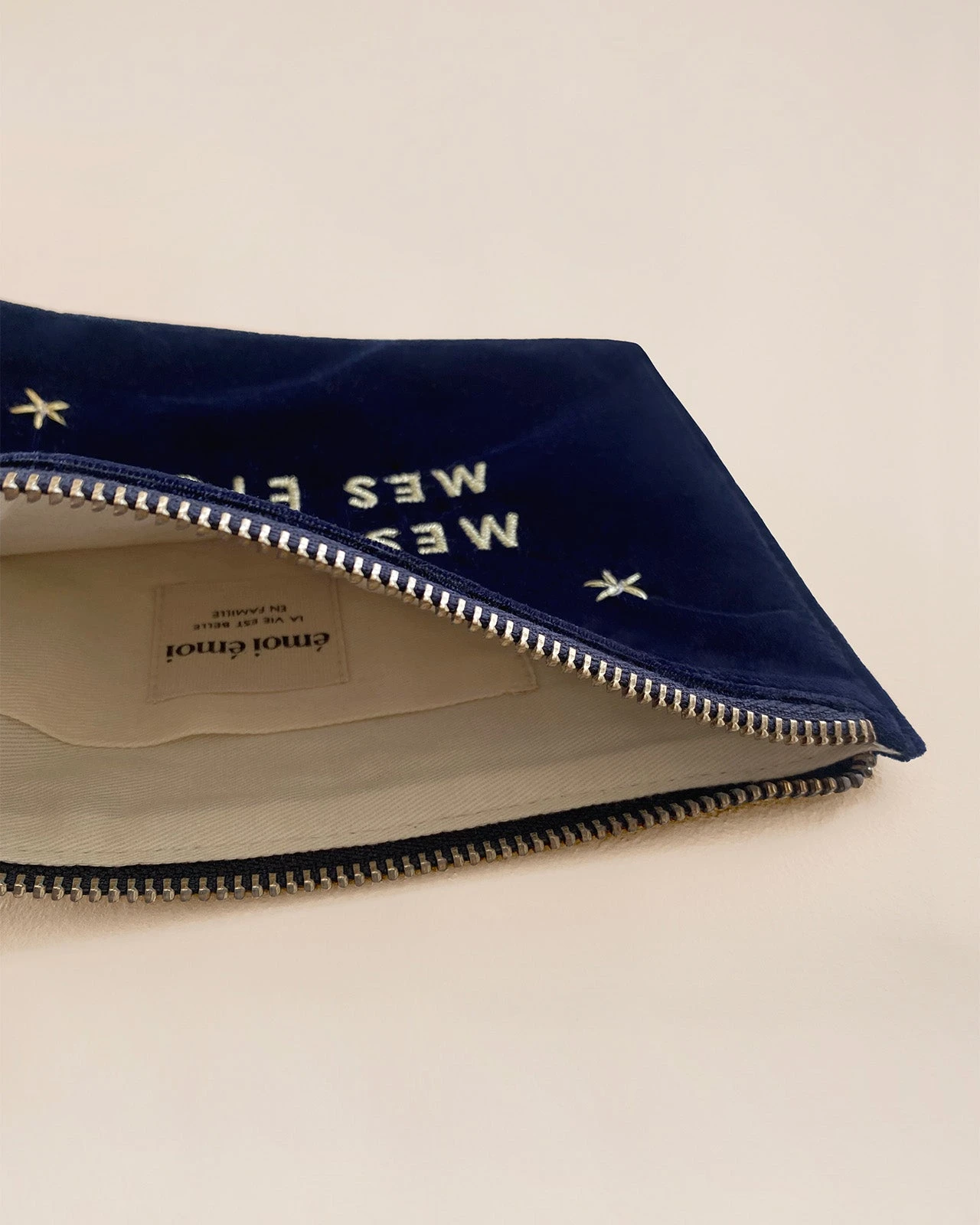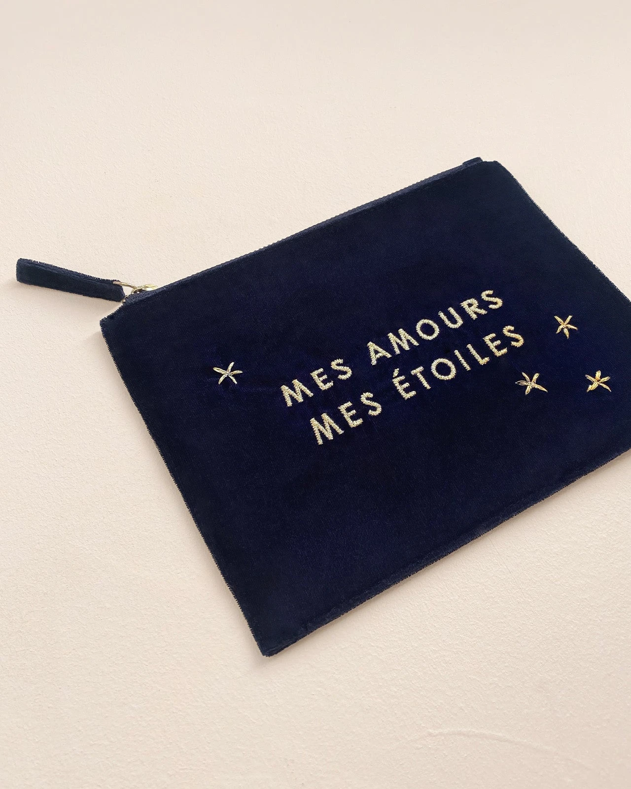 Pour célébrer la création des nos bijoux, on a imaginé une pochette en velours brodée de fil d’or « mes amours, mes étoiles ». Pour emmener vos bijoux partout.