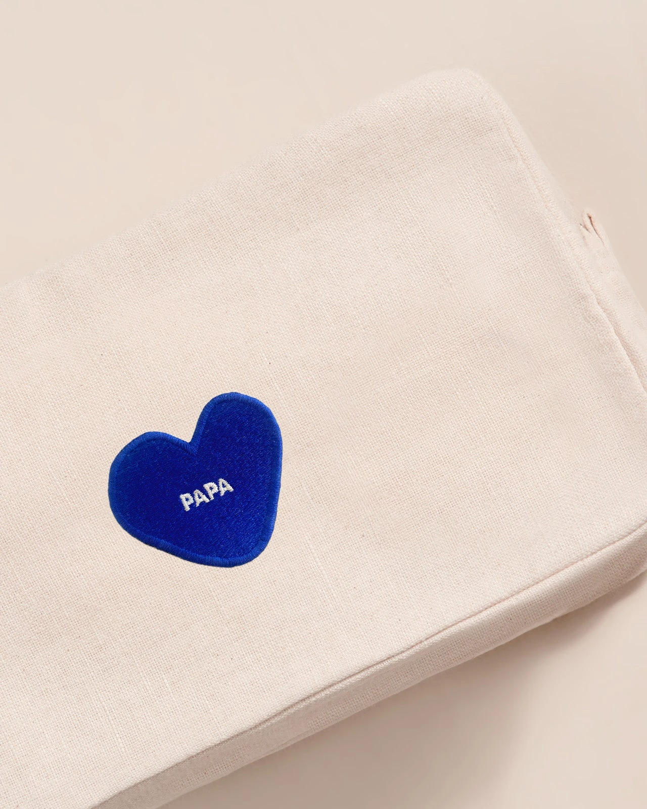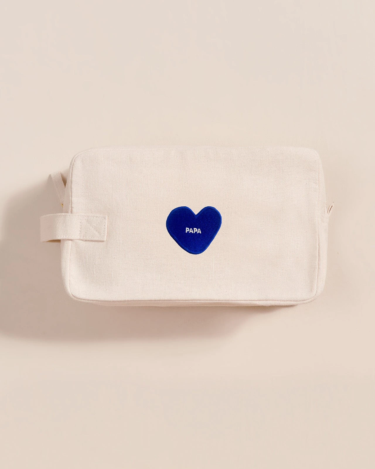 Coeurs sur nos trousses de toilette en lin, on a brodé le petit nom de votre choix sur notre coeur bleu.