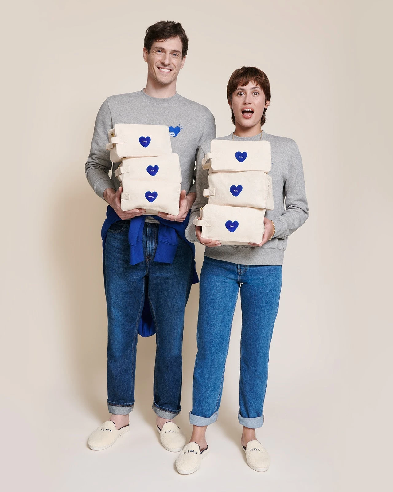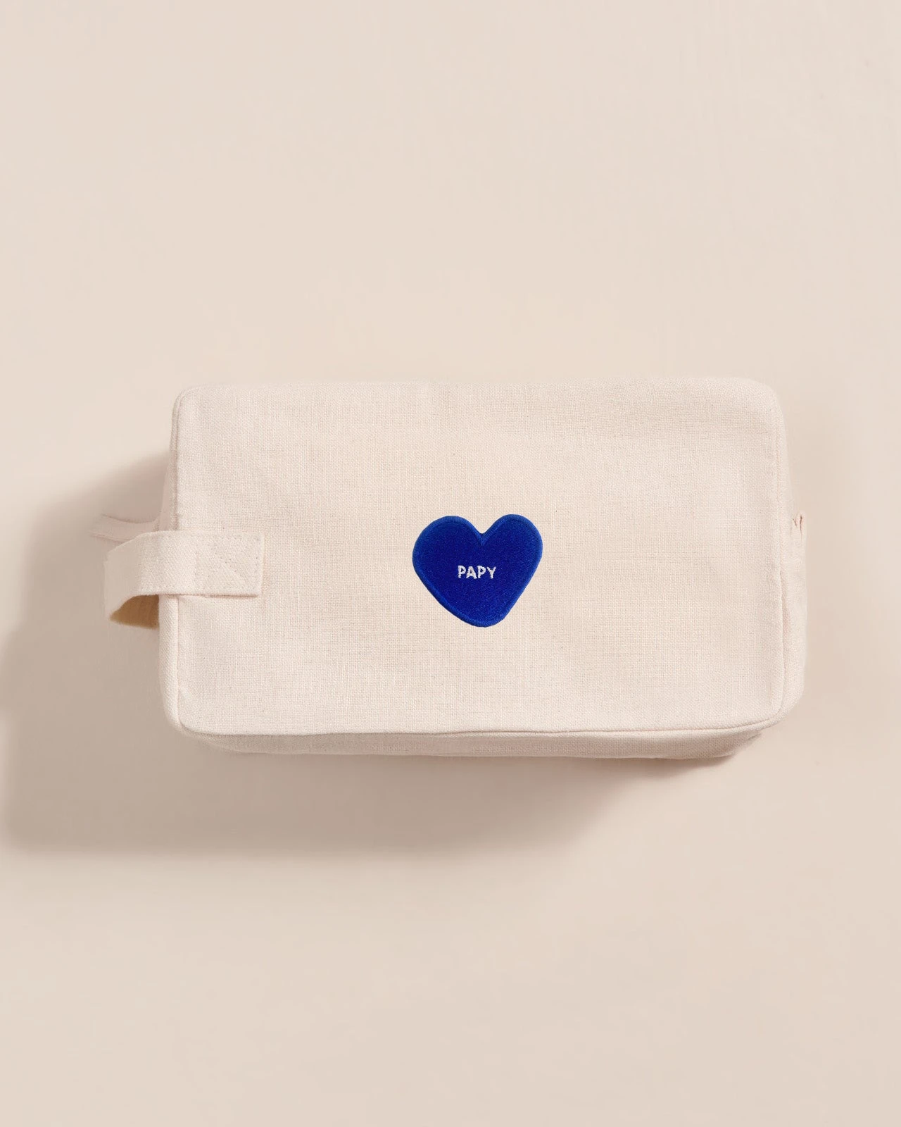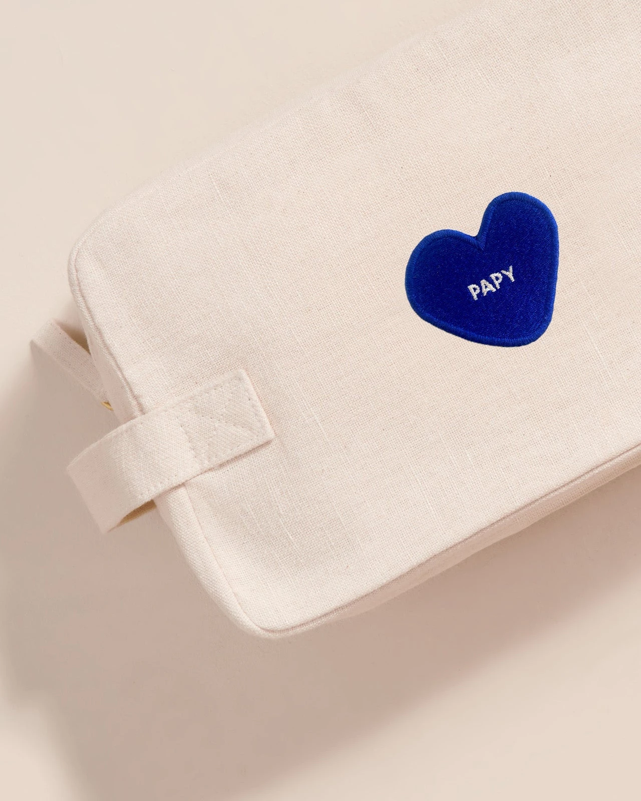 Coeurs sur nos trousses de toilette en lin, on a brodé le petit nom de votre choix sur notre coeur bleu.