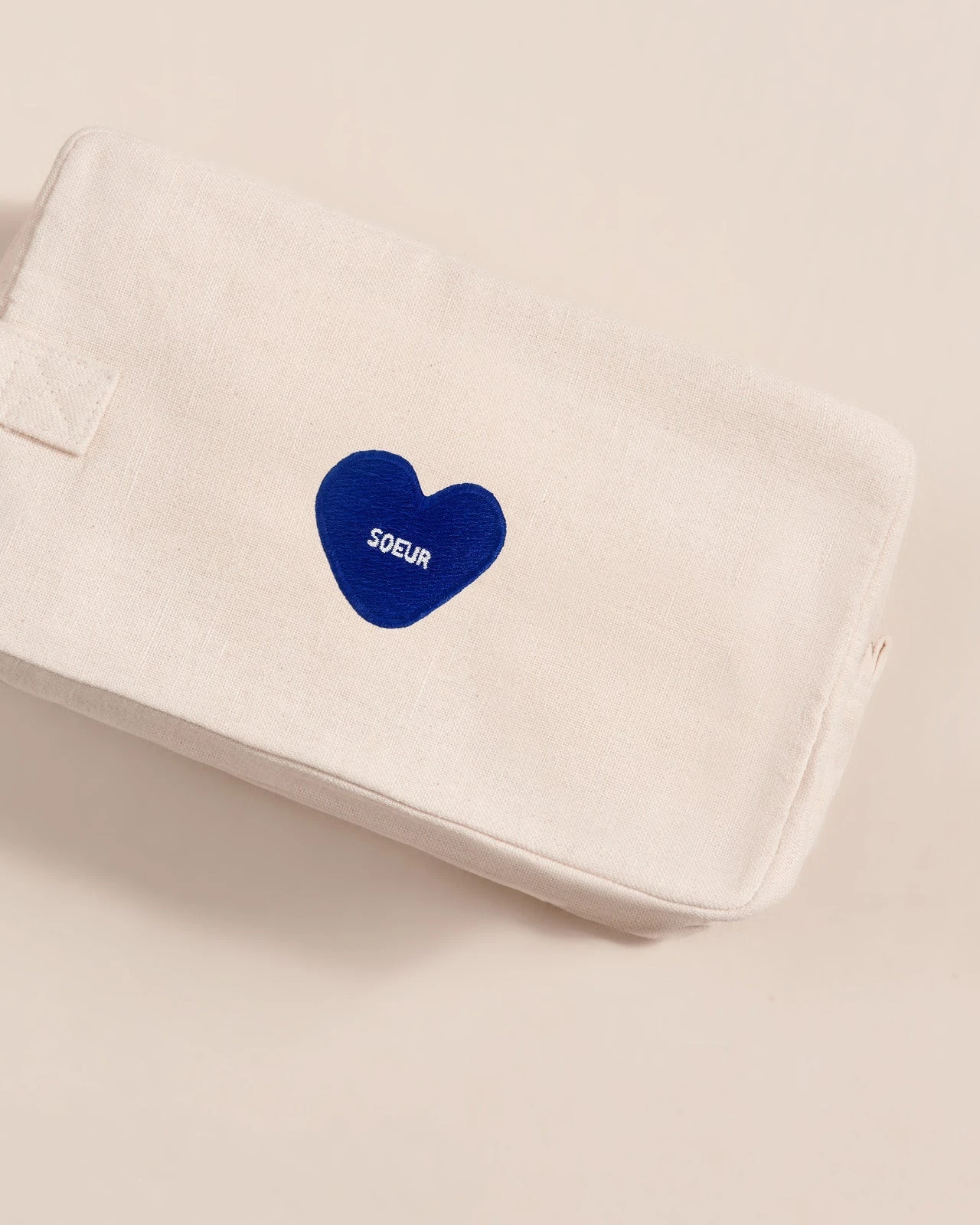 Coeurs sur nos trousses de toilette en lin, on a brodé le petit nom de votre choix sur notre coeur bleu.