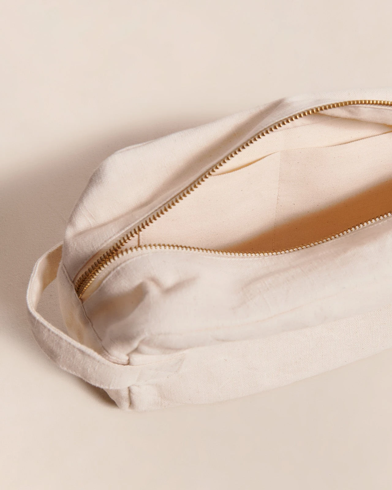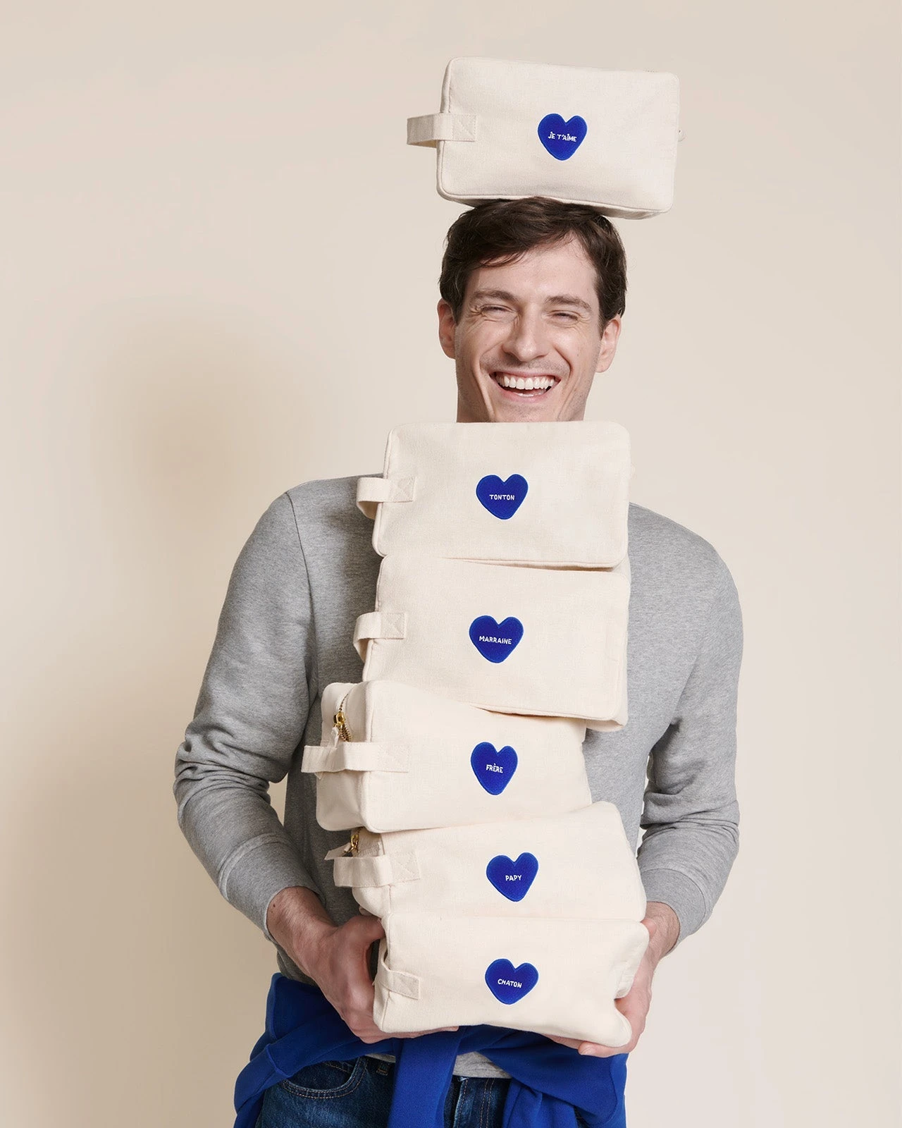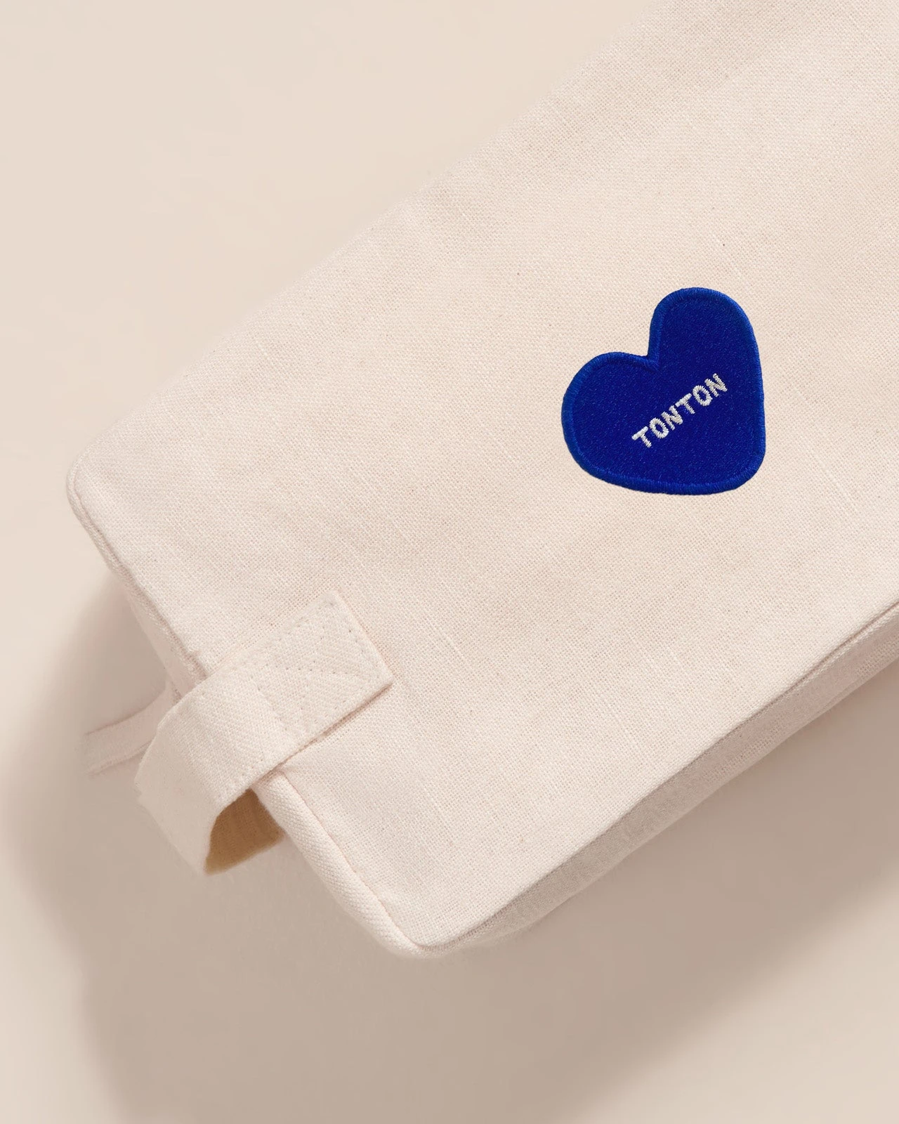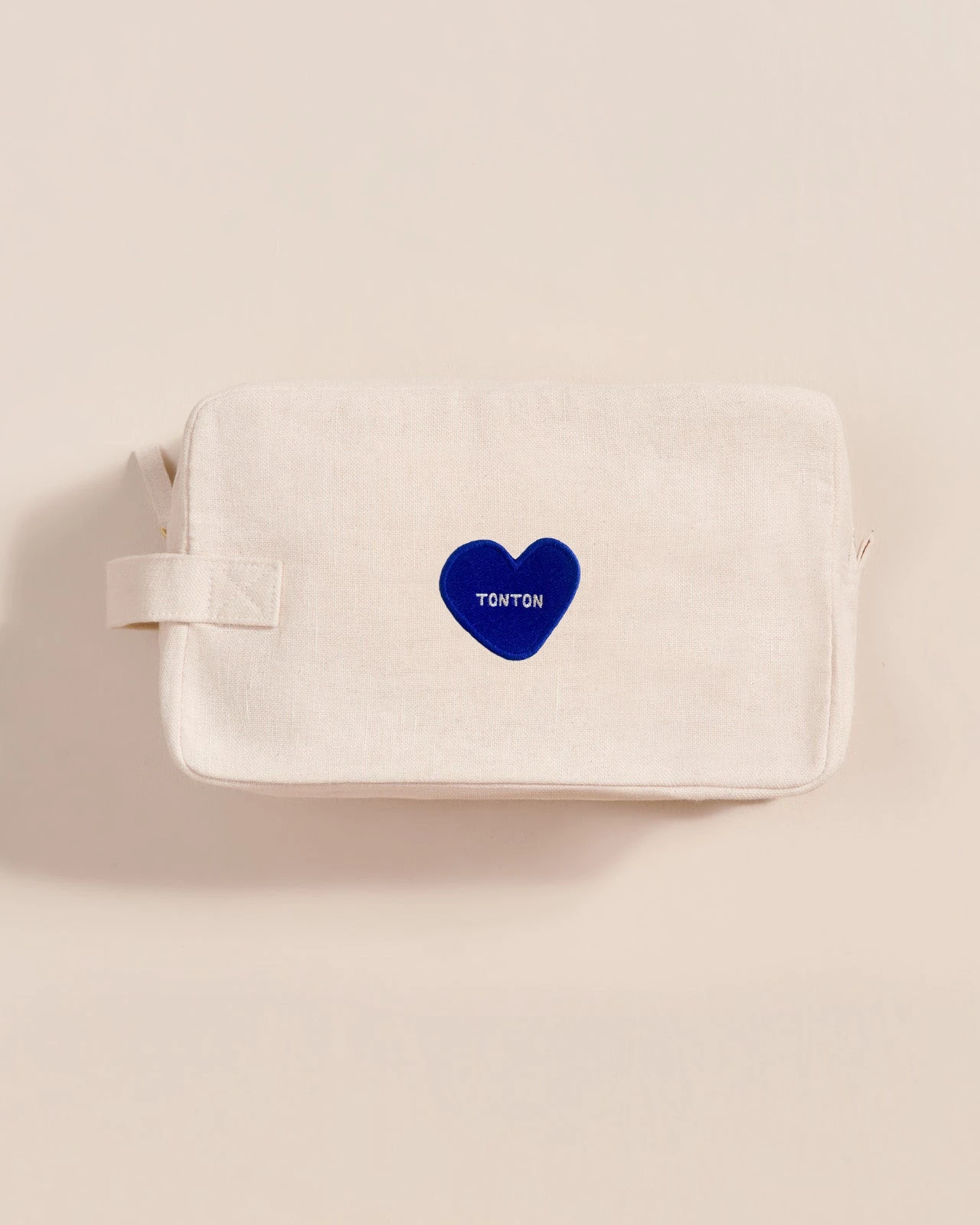 Coeurs sur nos trousses de toilette en lin, on a brodé le petit nom de votre choix sur notre coeur bleu.