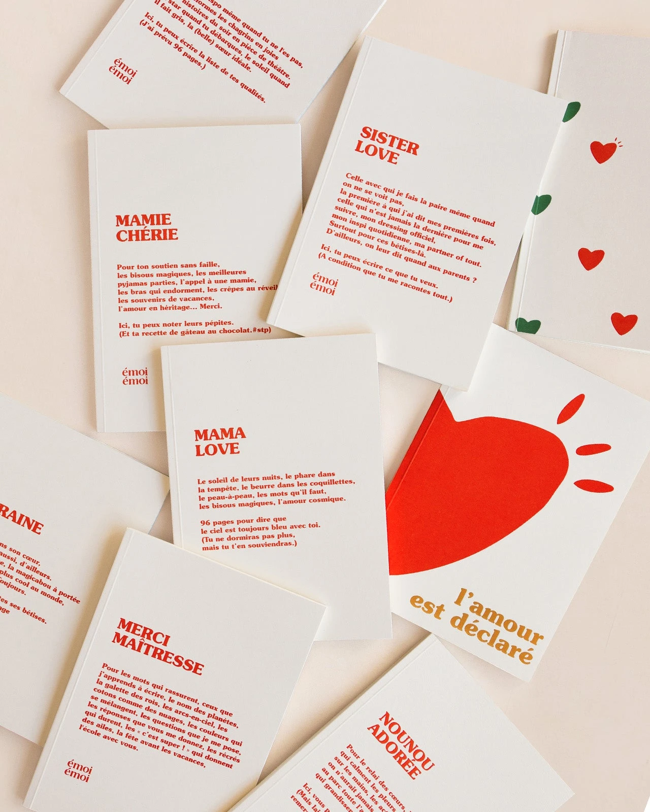 Notre collection de 9 carnets, c’est 7 déclas pour celles qui comptent (Mamie chérie, Fée marraine, Tata, Sister, Mama, Nounou, Maîtresse…), 1 carnet avec nos cœurs rouges et verts et 1 carnet signature : “L’amour est déclaré”.