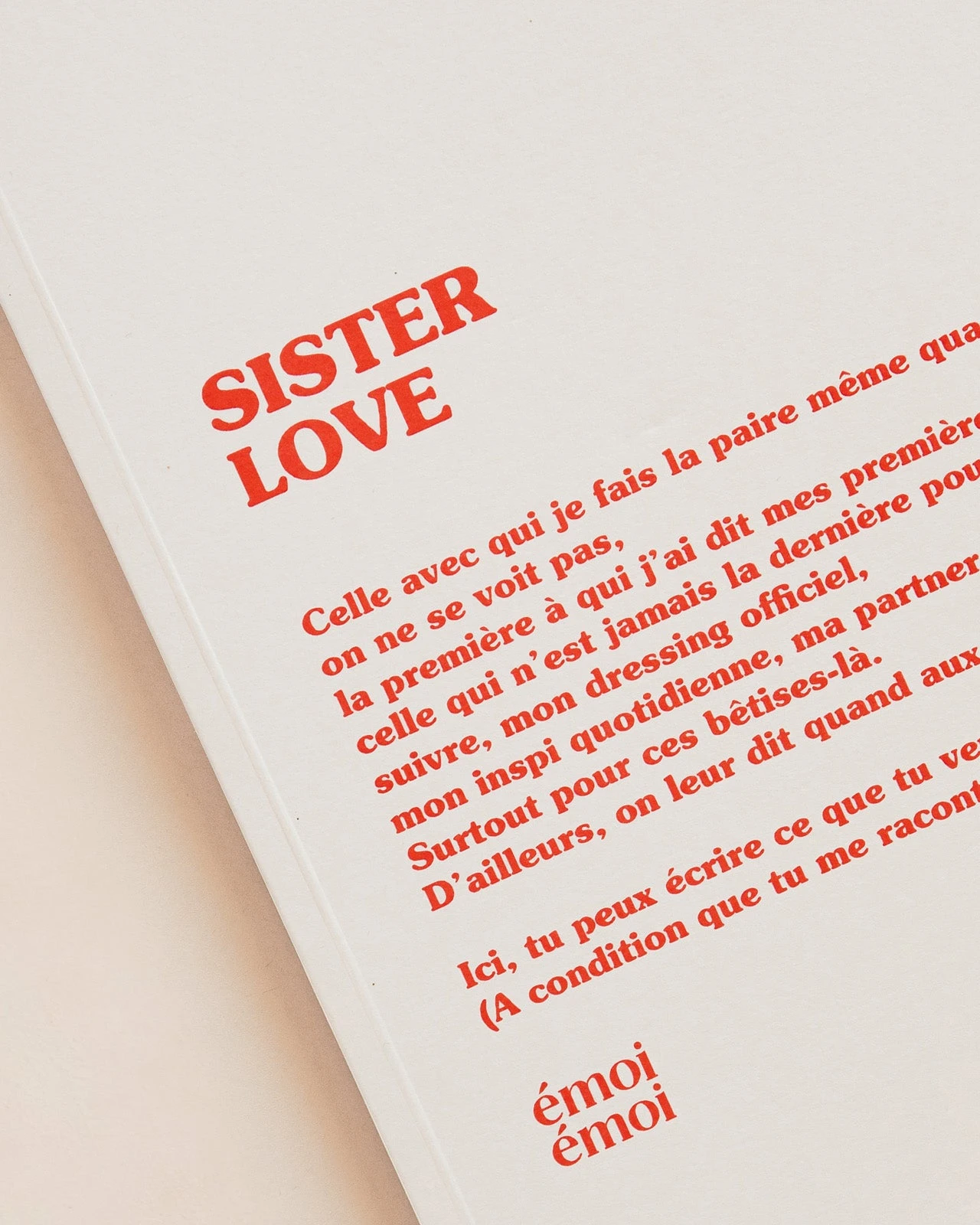 – Déclaration d’amour pour « Sister love » imprimée en rouge sur la couverture
