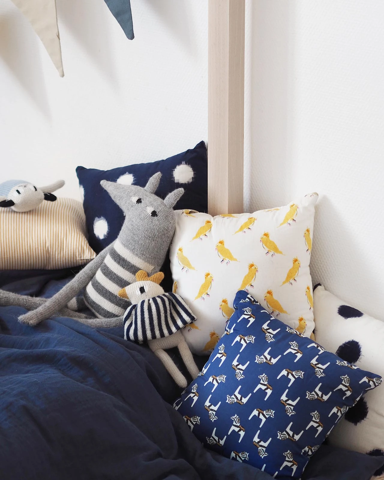 Coussin imprimé, motif « Petits Chevaux », un bel imprimé mixte et intemporel, qui rappelle les manèges et les petits chevaux de bois. Imprimé à la main, au cadre, dans un indigo lumineux, il apporte de la couleur dans nos maisons du bonheur et décore avec goût une chambre de bébé, d’enfant, d’adulte ou un salon. Il s’associe à merveille aux autres coussins de la collection, proposés dans des ikats lumineux et des imprimés exclusifs.