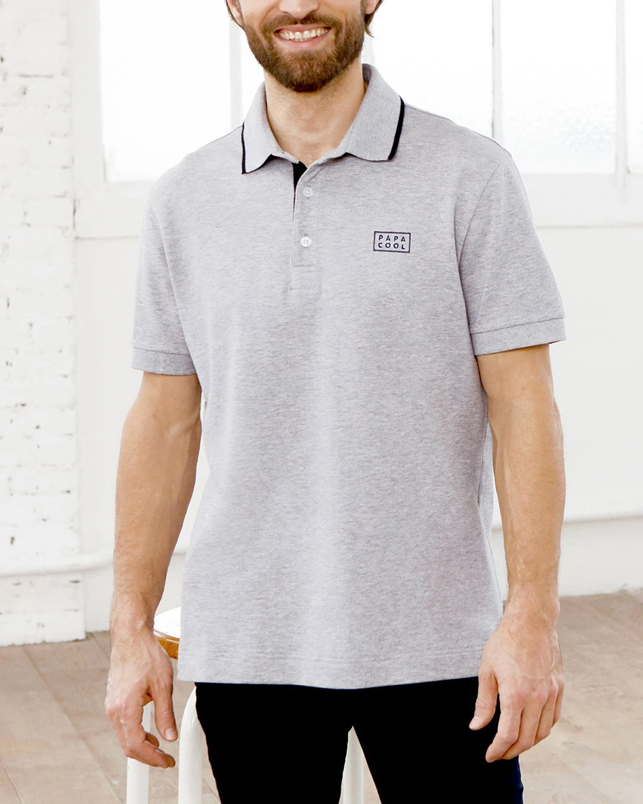 – Coupe droite, col polo fermé avec 3 petits boutons, manches courtes, finitions bords côtes au col et aux manches, patte de boutonnage et col contrastés