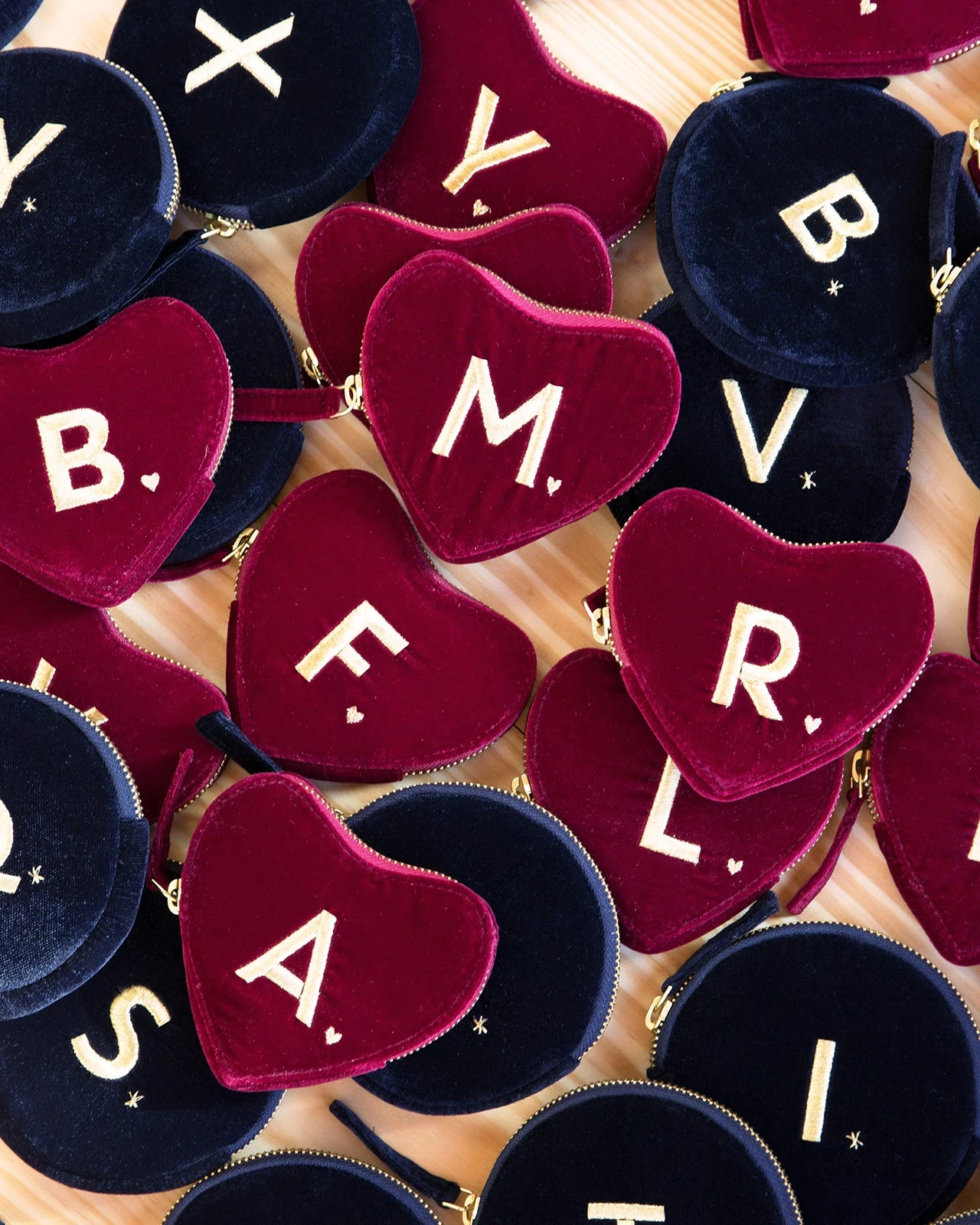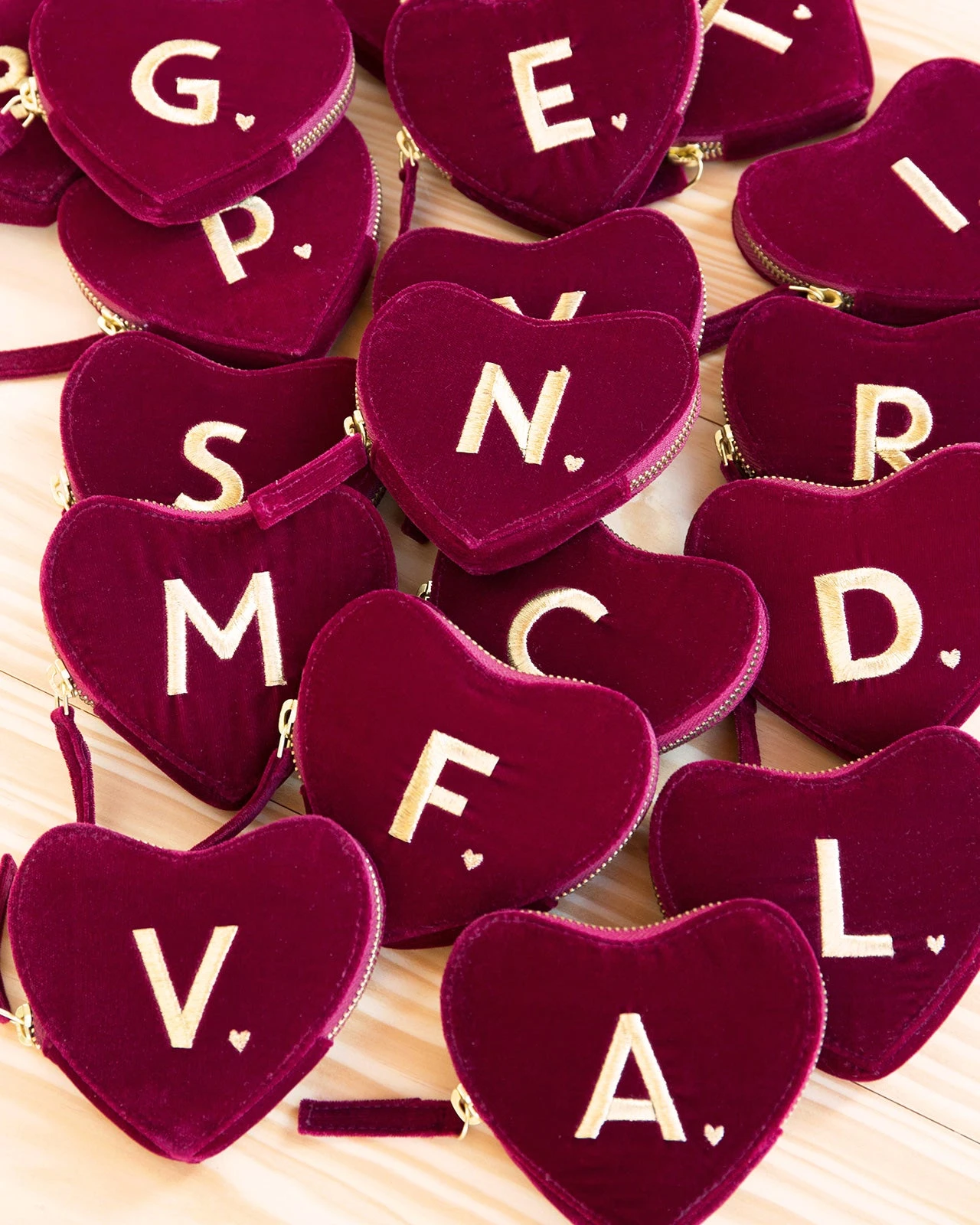 – Porte-monnaie en velours bordeaux en forme de cœur