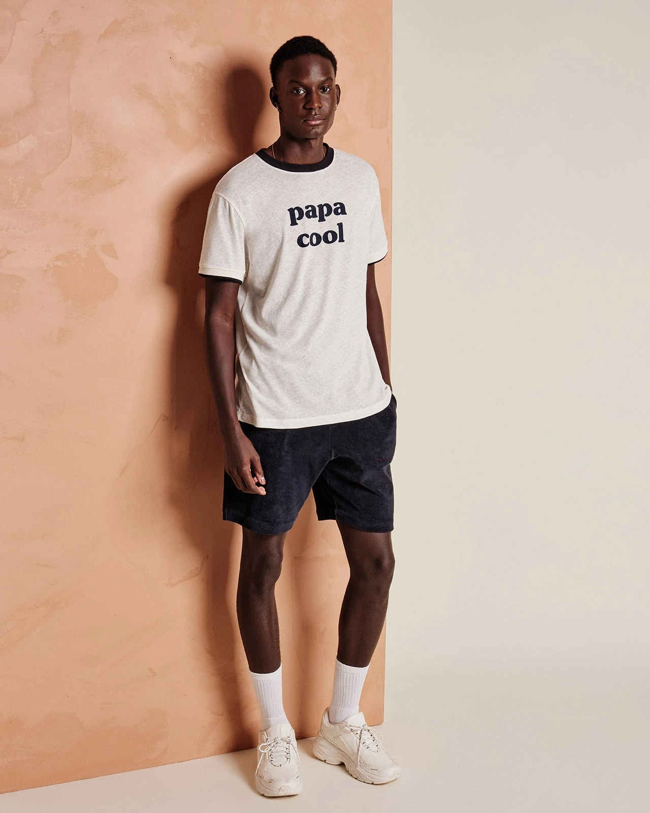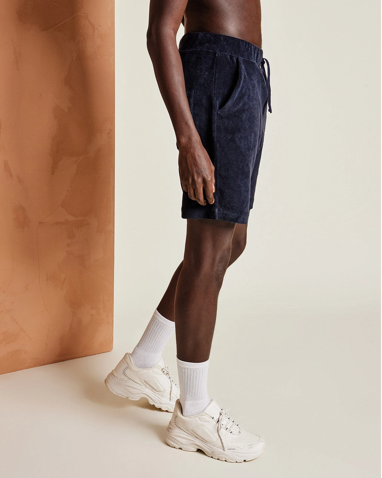 Chez l’homme, le short Samuel en éponge, une coupe mi-longue parfaitement ajustée, une taille élastiquée et réglable et des poches.