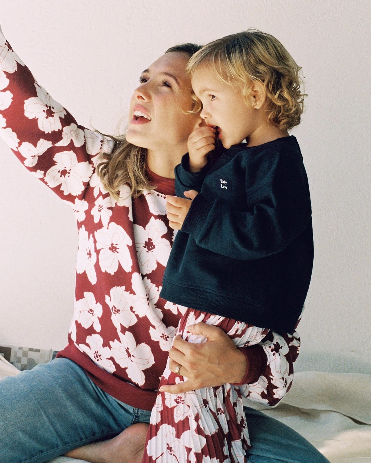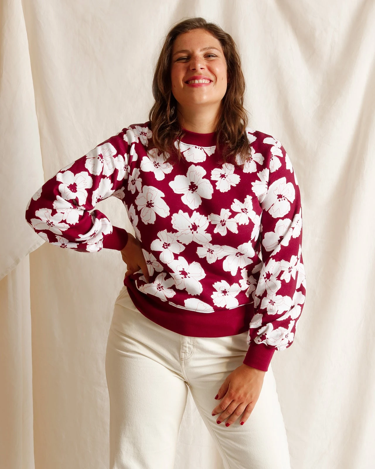 Côté coupe, on l’a souhaitée fittée et manches ballons pour la femme, oversize pour les filles.