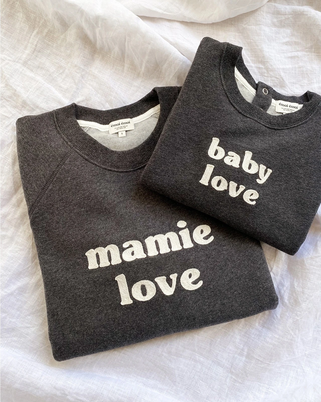 – À porter en famille : ensembles gris anthracite homme, femme et enfant disponibles avec nos imprimés « Love »