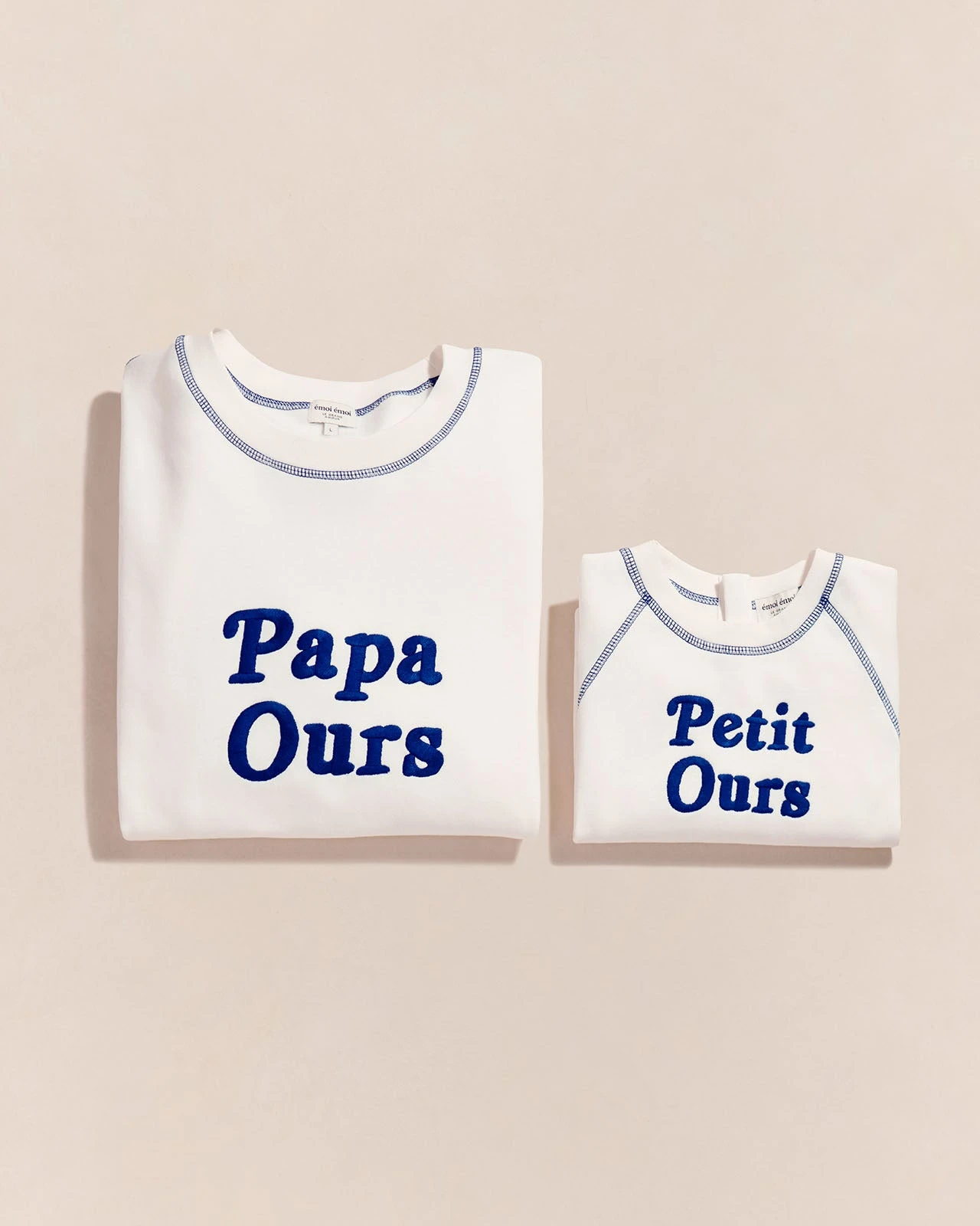 coton bio moelleux, surpiqûres olala, en blanc et bleu, lumineux.