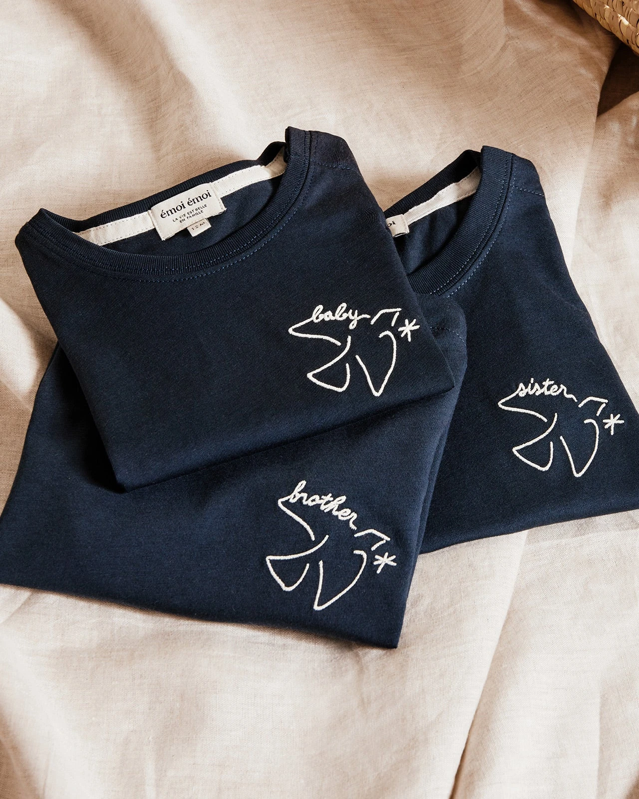 On a repris la formule magique qui avait fait battre les ailes de Mama, Papa et Baby bird : du coton bio et une broderie signature qui dit Je t’aime, tout près du coeur.