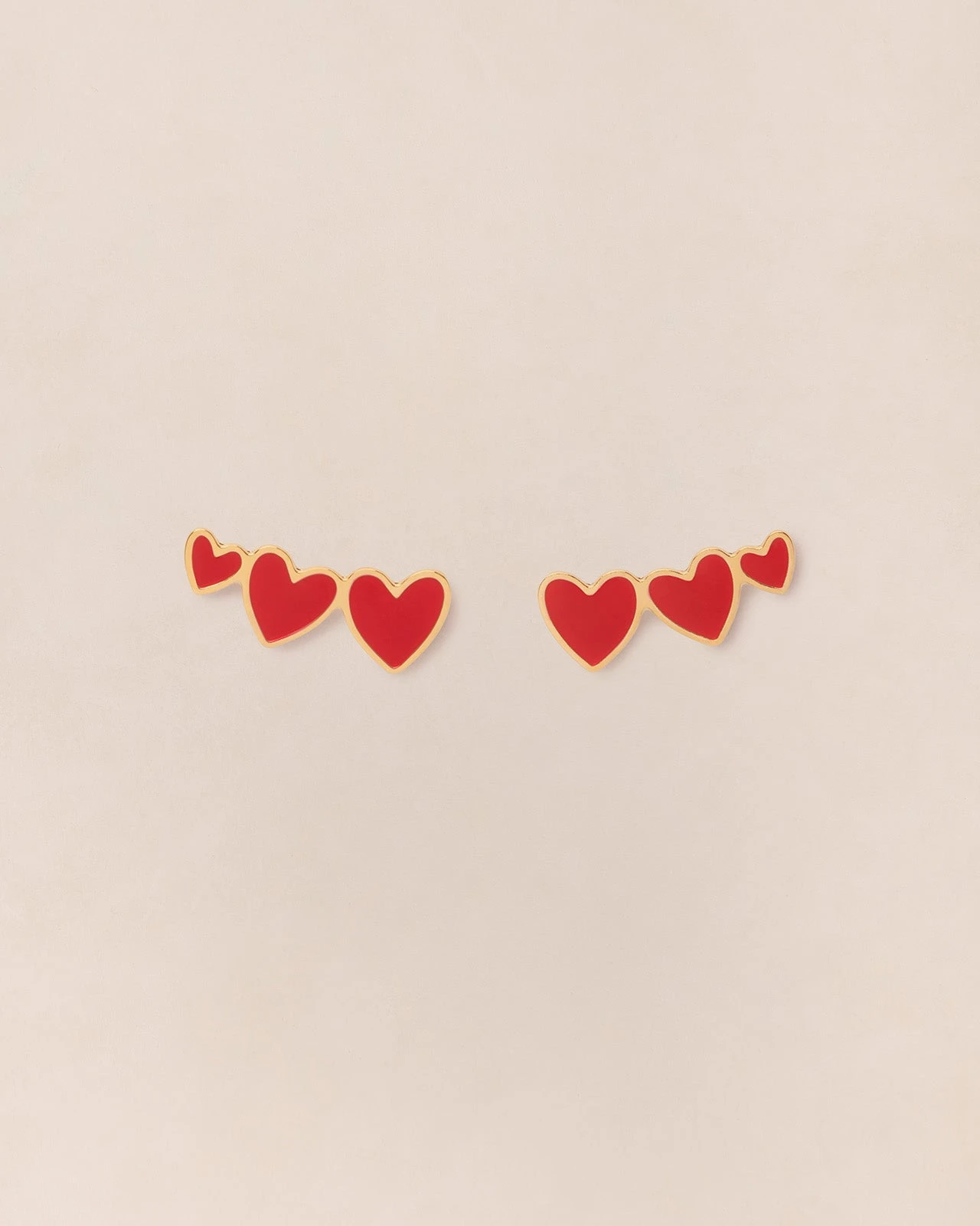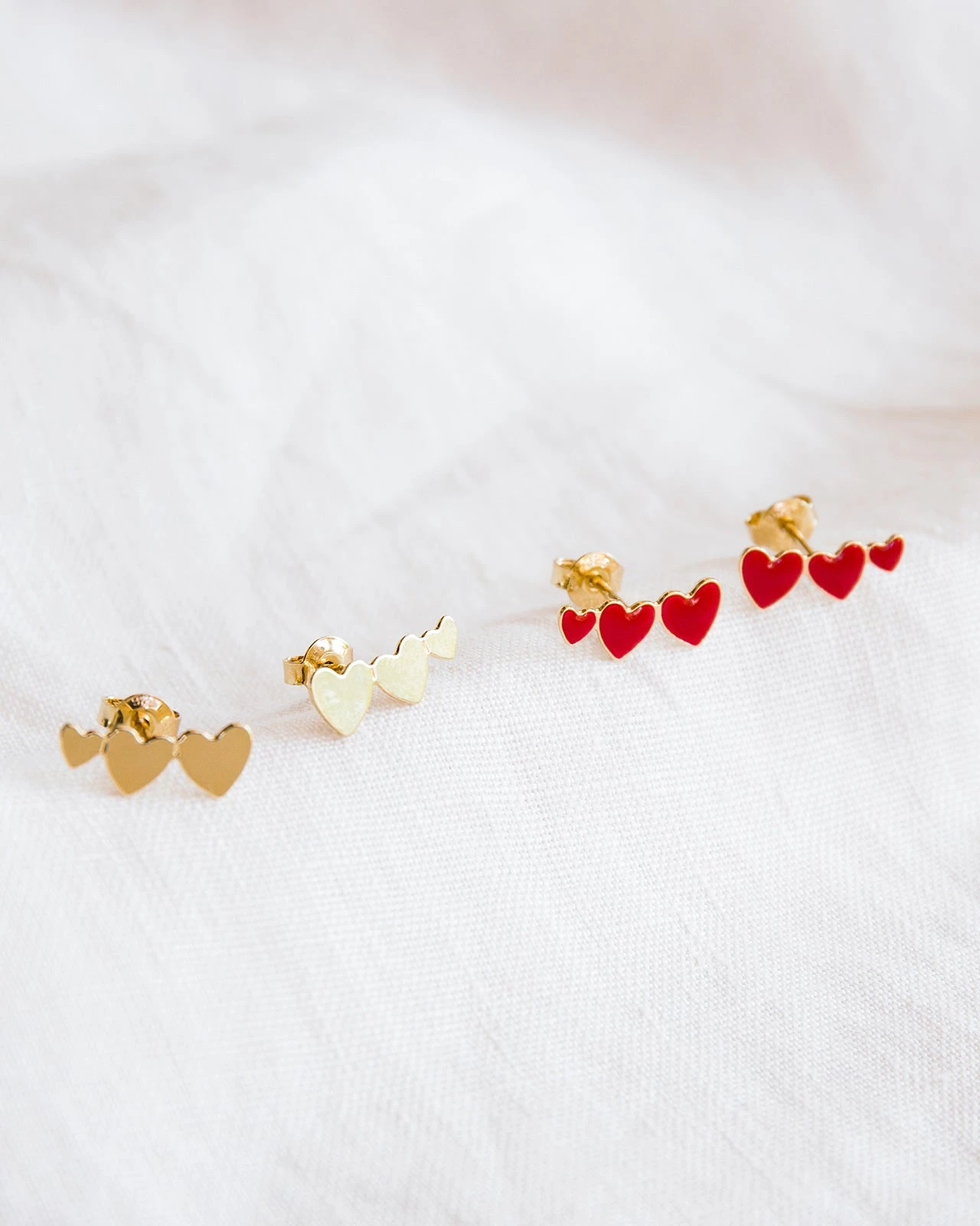– Boucles d’oreilles 3 coeurs, en laiton plongé dans un bain d’or 24 carats et peintes à la main.
