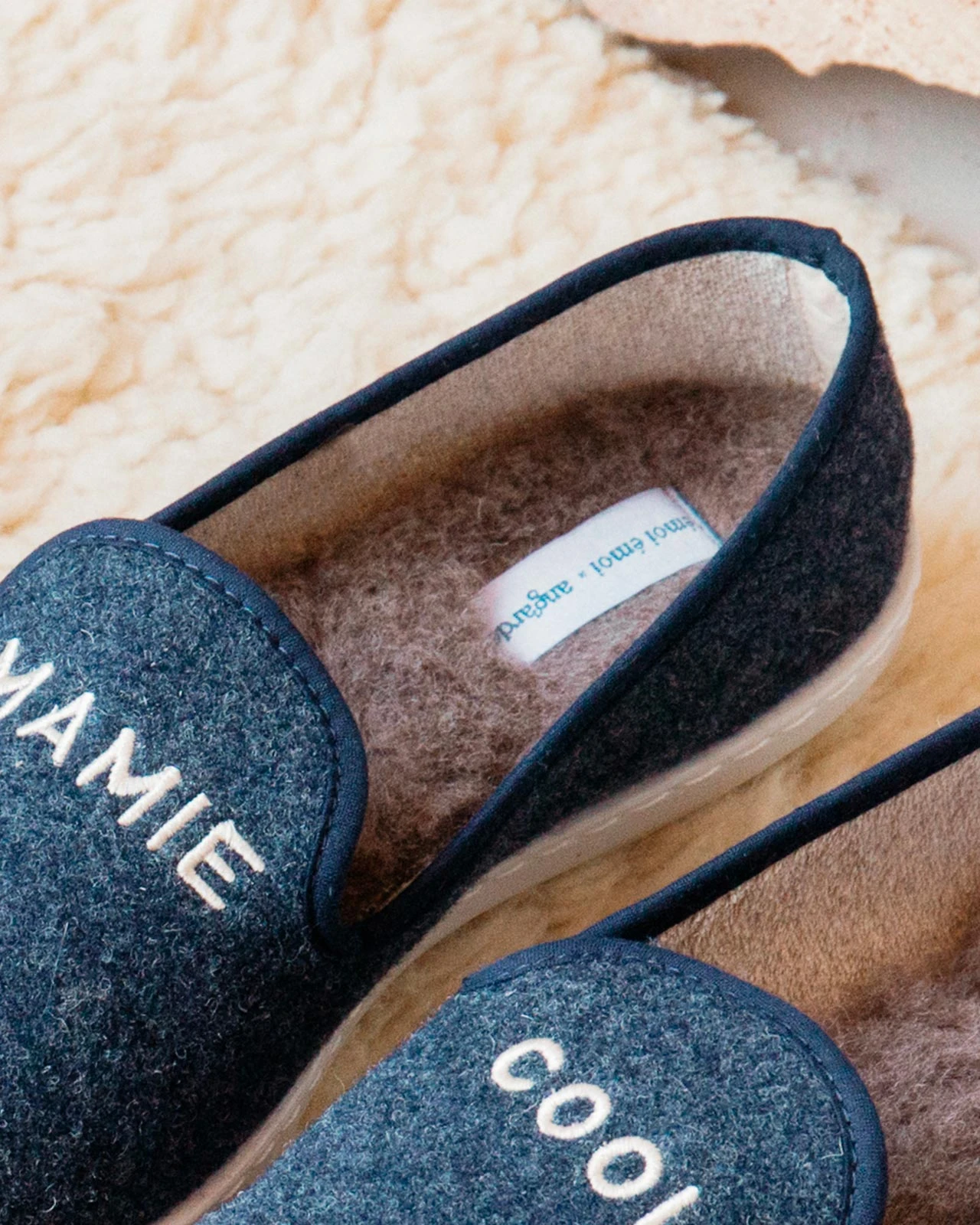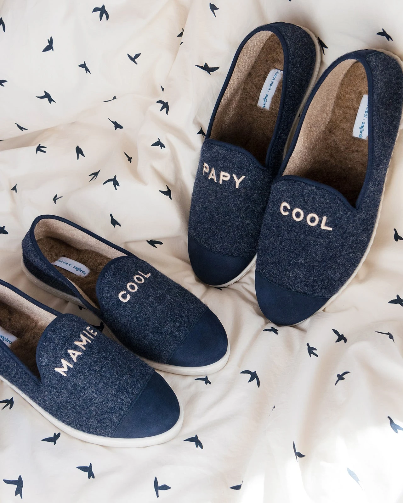 – À porter en famille : chaussons brodés « Cool » disponibles pour Mama, Mamie, Papa, Papy et Mini cool