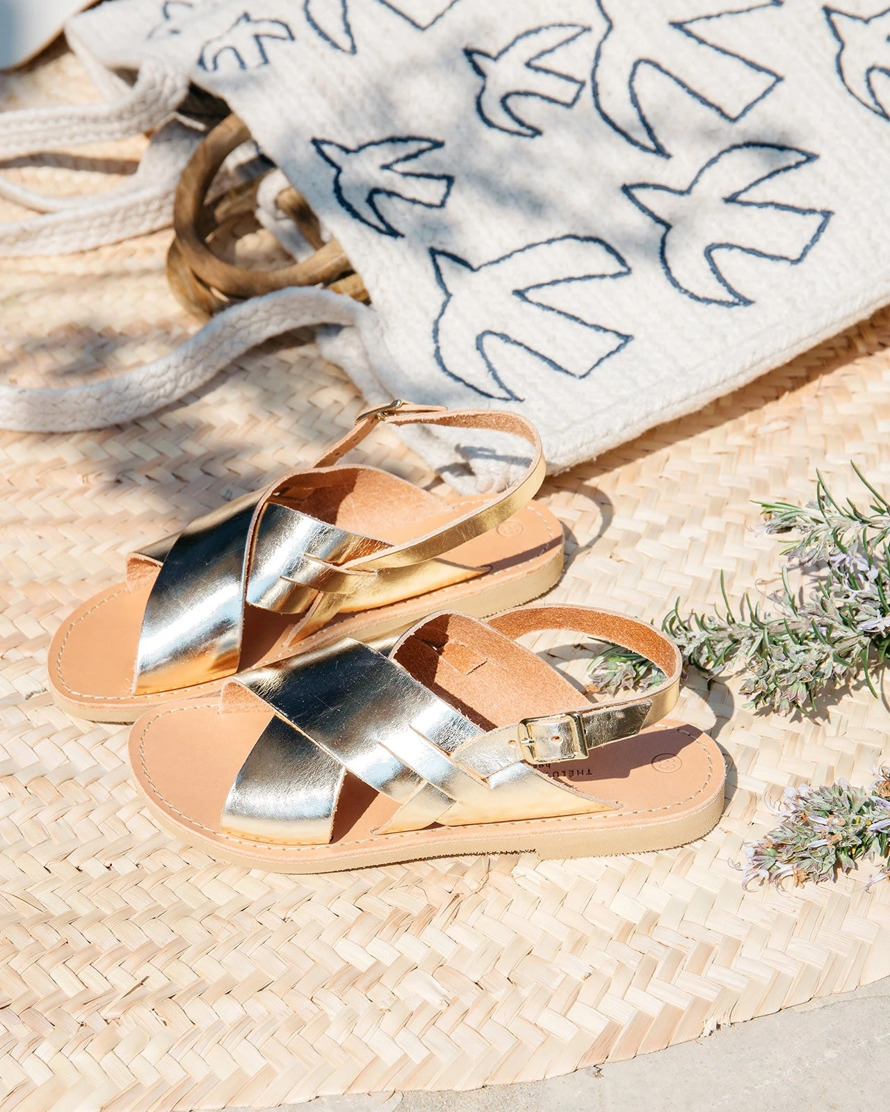 – Larges lanières dorées croisées sur le devant et bribe ajustable au talon pour un maintien idéal.