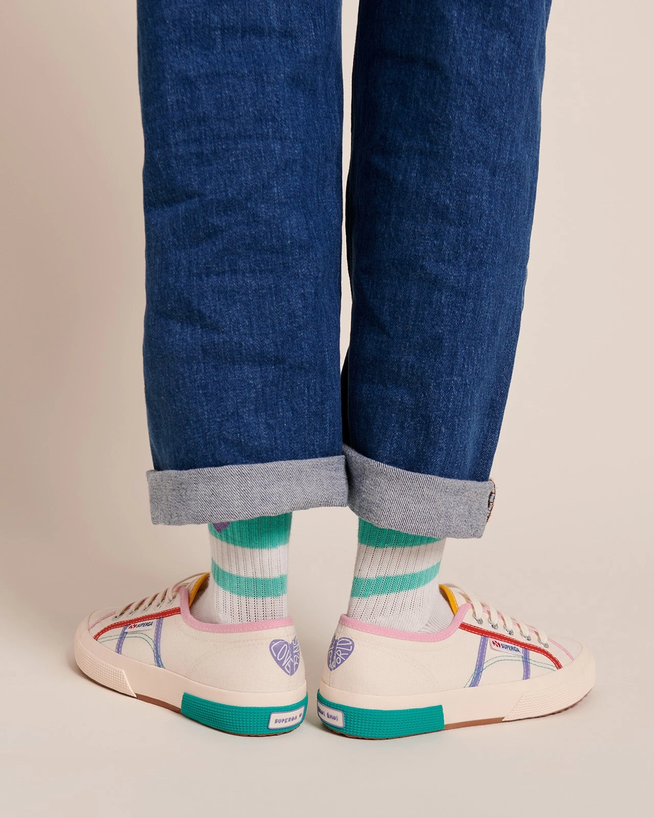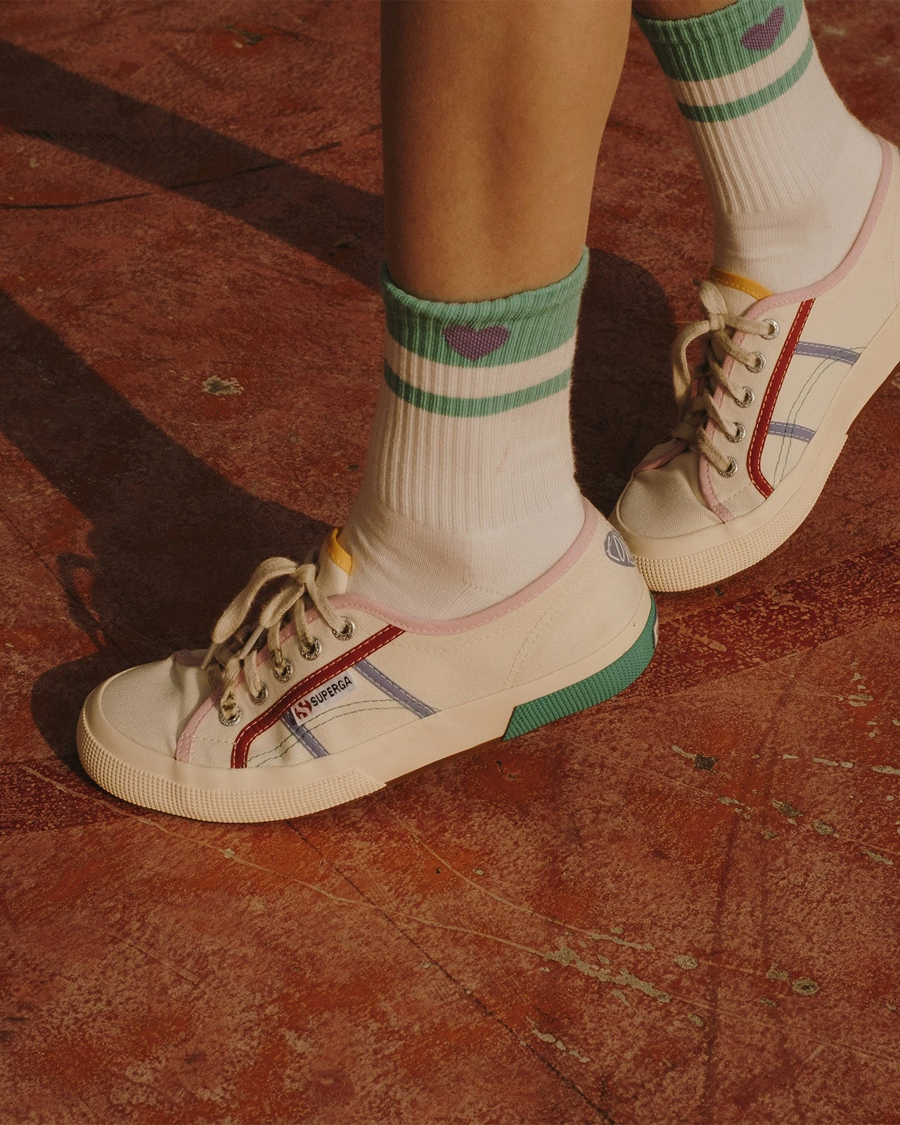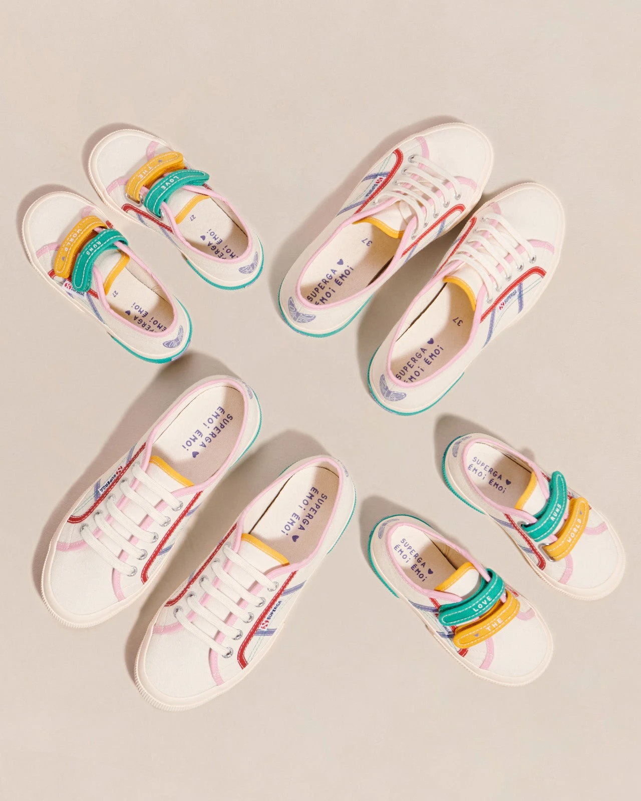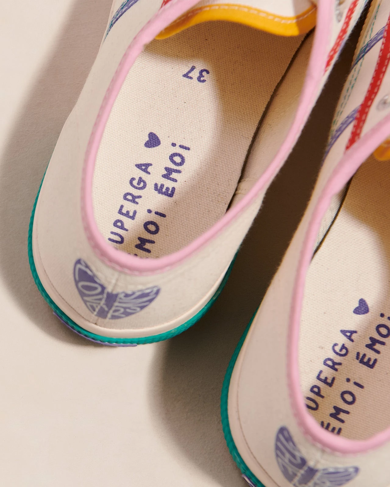 – Cœur imprimé violet à l’arrière de la chaussure avec inscription Love runs the world »